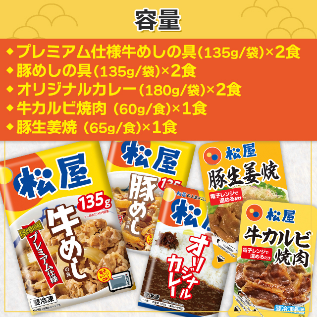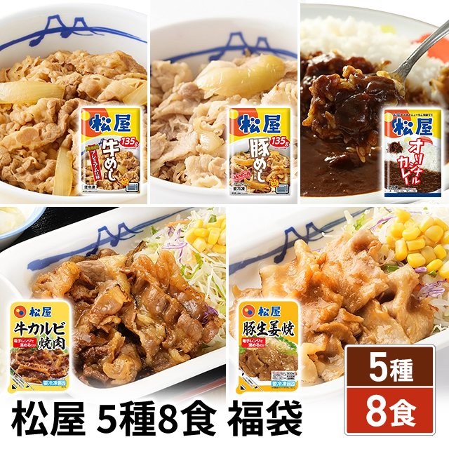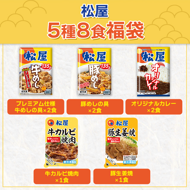 商品名 松屋 5種8食福袋 (牛めし×2 豚めし×2 オリジナルカレー×2 カルビ焼肉×1 豚生姜焼肉×1) 容量 プレミアム仕様牛めしの具(135g/袋)×2食