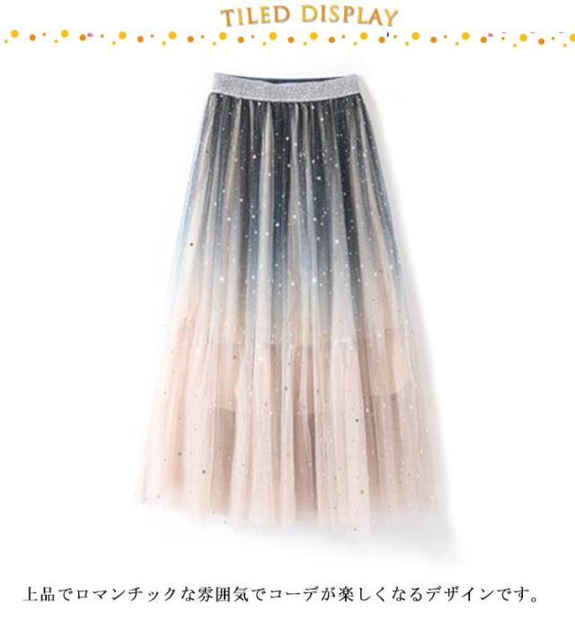 送料無料 星空 プリーツスカート 配色 スカート バイカラー チュールスカート レディース フレア チュールスカート ボトムス ミモレ丈 グラデーション チュールスカート 大人 スカート 星柄 体型カバー フレア 裏地あり ウエストゴム Aライン