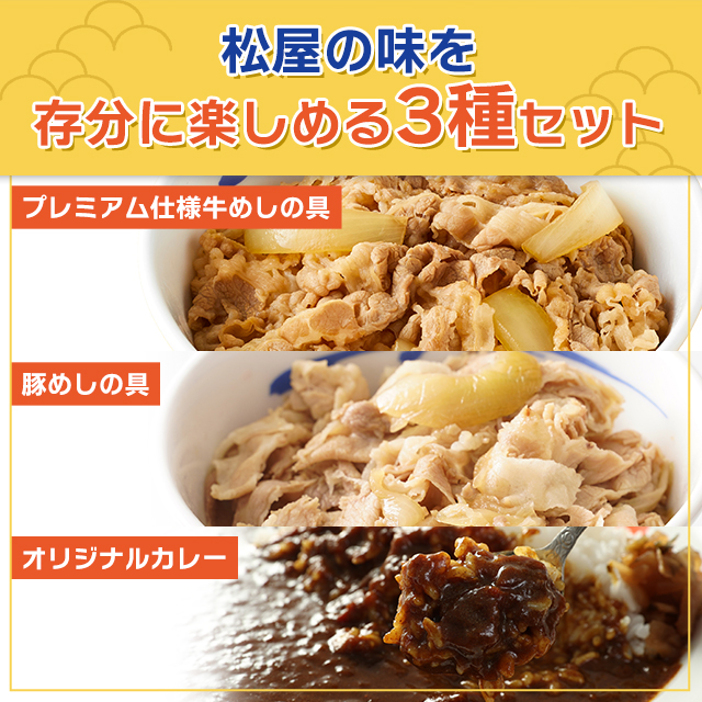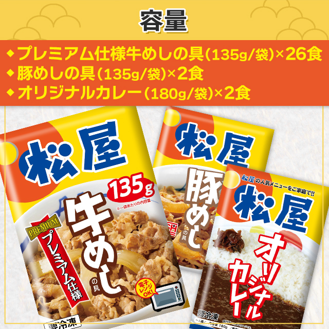 商品名 松屋 30食セット プレミアム仕様牛めしの具×26食 豚めしの具×2食 オリジナルカレー×2食 容量 プレミアム仕様牛めしの具(135g/袋)×26食