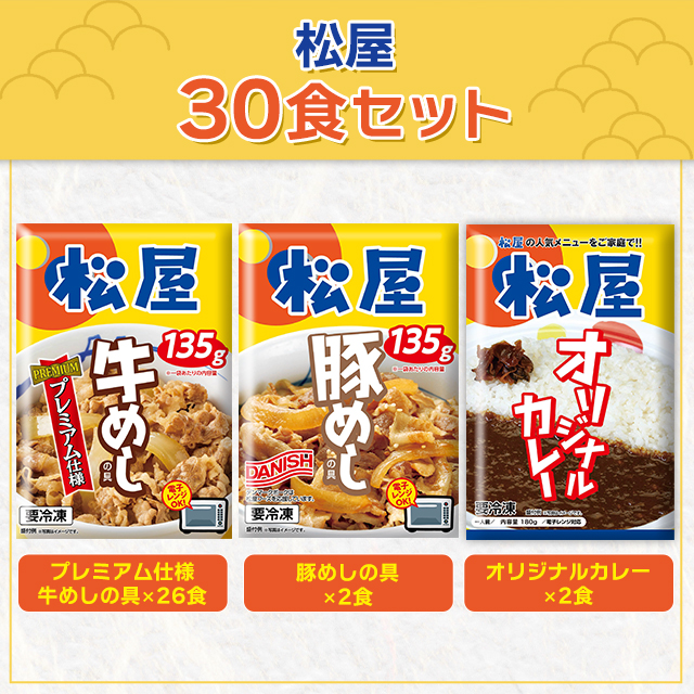 送料込み 松屋 30食セット プレミアム仕様牛めしの具 ×26食 豚めしの具 ×2食 オリジナルカレー ×2食 牛めし 豚めし カレー セット アソート 冷凍 惣菜