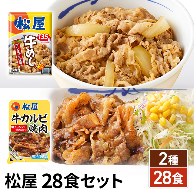 送料込み 松屋 28食セット プレミアム仕様牛めしの具 ×26個 牛カルビ焼肉 ×2個 牛めし 牛カルビ 焼肉 セット アソート 冷凍 惣菜