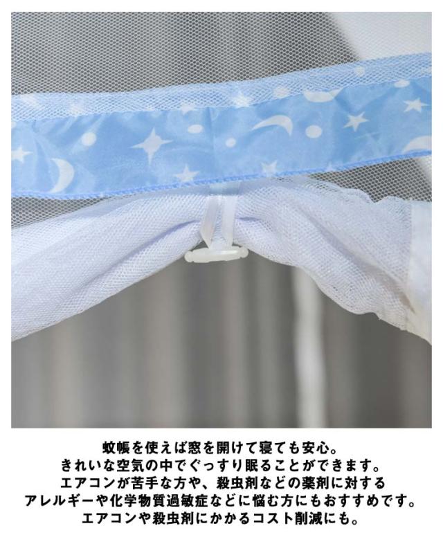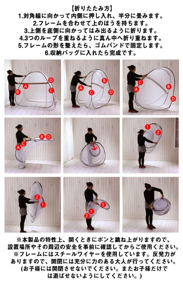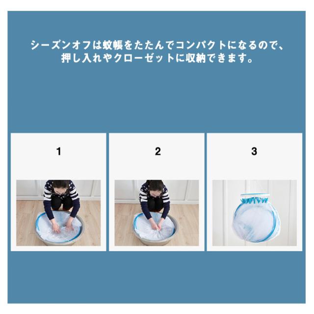 | ・簡単組立!パッと開いて自立する蚊帳。夏場の蚊やムカデ対策にオススメです! ・底面約180×200cm、ダブルサイズ敷き布団がまるごと入るゆったりサイズ。 ・高さも適度にあるので、蚊帳の圧迫感を感じることもありませんので、快適な睡眠をお楽しみ下さい。 ・天井から吊り下げるタイプとは異なり、丈夫な生地の底付きなので、360度全方位をしっかりとガードしてくれます。 ・出入り口はファスナーで開閉できる巻き上げタイプになっているので、お布団の出し入れがしやすいのも特徴です。 ・また、入り口が2箇所ありどちらからでも入れるので、子供を寝かした後、こっそり反対側から出られたりと便利なことも◎。 ・ワンタッチ蚊帳の使い方はとっても簡単。収納袋から取り出して広げれば、たったの1分で設置できます。 ・シーズンオフは蚊帳をたたんでコンパクトになるので、押し入れやクローゼットに収納できます。 ・蚊帳を使えば窓を開けて寝ても安心。きれいな空気の中でぐっすり眠ることができます。 ・エアコンが苦手な方や、殺虫剤などの薬剤に対するアレルギーや化学物質過敏症などに悩む方にもおすすめです。エアコンや殺虫剤にかかるコスト削減にも。 【折りたたみ方】 1.対角線に向かって内側に押し入れ、半分に畳みます。 2.フレームを合わせて上のほうを持ちます。 3.上側を底側に向かってはみ出るように折ります。 4.3つのループを重ねるように真ん中へ折り重ねます。 5.フレームの形を整えたら、ゴムバンドで固定します。 6.収納バッグに入れたら完成です。 ※本製品の特性上、開くときにポンと跳ね上がりますので、設置場所やその周辺の安全を事前に確認してからご使用ください。 ※フレームにはスチールワイヤーを使用しています。反発力がありますので、開閉には充分に力のある大人が行ってください。 (お子様には開閉させないでください。またお子様だけでは遊ばせないようにしてください。) | |