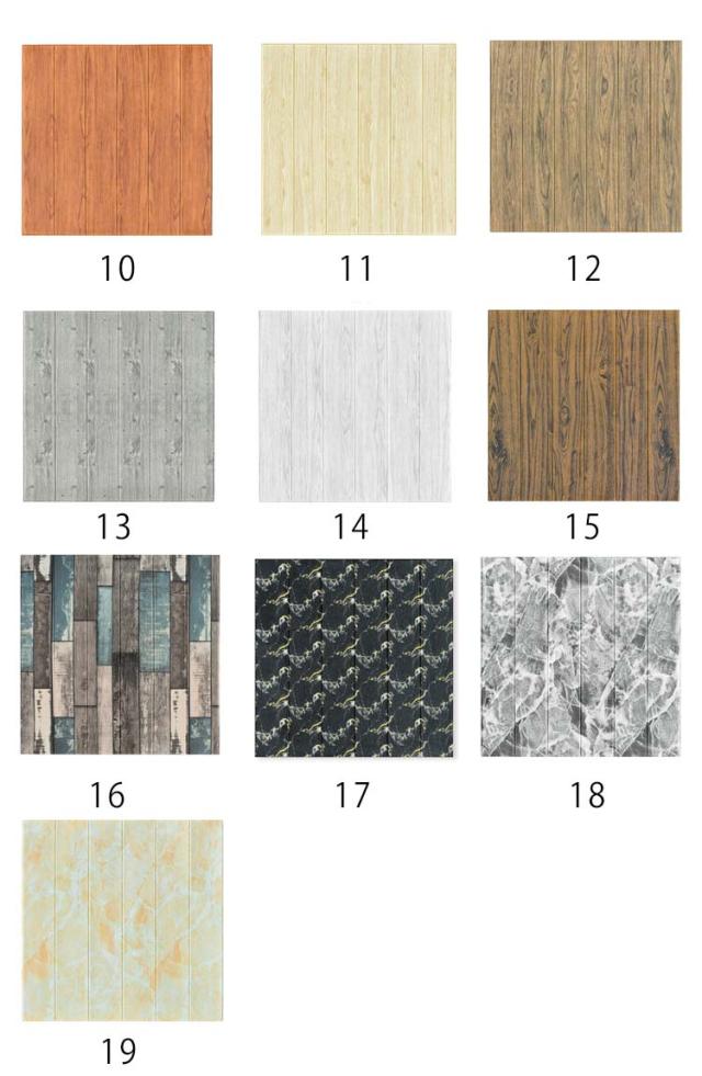 | 選べる3タイプ!木目調や大理石調、無地のクッション壁紙。 20枚入り 防水加工により色褪せしにくく、キッチン・浴室・トイレなどの水回りにも使えます。 裏紙を剥がして貼るだけ! 防水、防汚、防カビ、防音と非常に多機能で、汚れても水拭きするだけで清潔さを維持できます。 リビングや子供部屋、キッチンなどの壁面の汚れ防止、キズ防止、キズ隠しが簡単にできます。 ハサミやカッターで好きなサイズにカットすることもできます。 | |