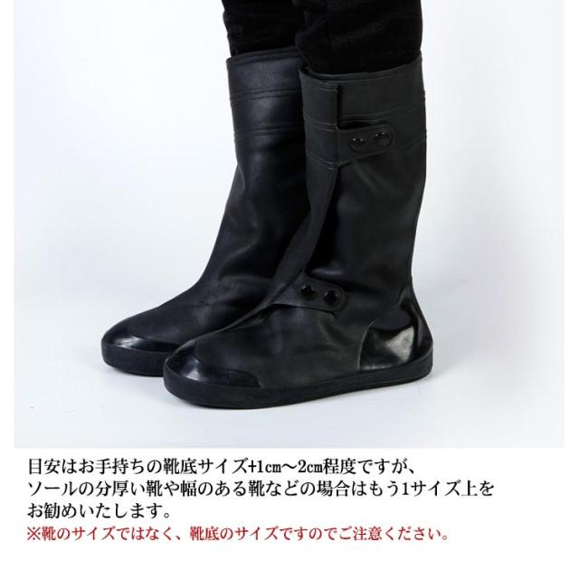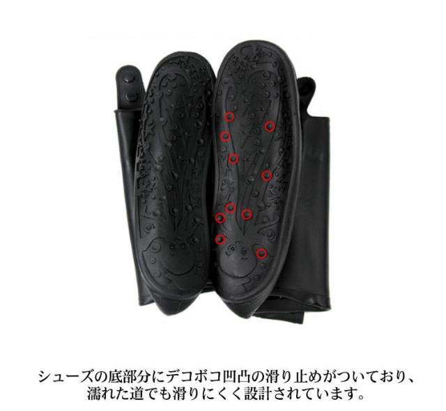 | あなたの靴を雨から守る!心強い相棒が登場!!! 靴の上からサッと履けるレインシューズカバー。 突然の雷雨、ゲリラ豪雨・・・ 大雨警報・大雨注意報が出ている悪天候での外出や通勤・通学・・・ 台風だけど仕事や学校で外出しなくてはいけない状況・・・ 傘をさしても、靴はビジョビジョ・・・ どうすればあの大雨時の靴のビジョビジョの不快感を防げるのか・・・ 突然の大雨にも対応でき、レインブーツ(長靴)を持ち運びできない状況でも安心して使える物を!!! 目安はお手持ちの靴底サイズ+1cm〜2cm程度ですが、ソールの分厚い靴や幅のある靴などの場合はもう1サイズ上をお勧めいたします。 ※靴のサイズではなく、靴底のサイズですのでご注意ください。 靴の上から簡単に履けるので、突然の豪雨でも安心。 シューズの底部分にデコボコ凹凸の滑り止めがついており、濡れた道でも滑りにくく設計されています。 長靴を履いている感じで歩け、簡単折りたたみで、普段のバッグなどにも収納可能で邪魔にもなりません。 | |
