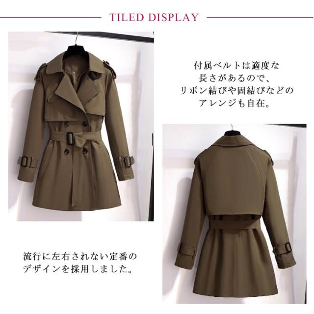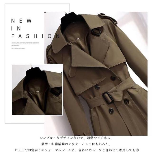 | 定番デザインのすっきりとしたトレンチコートです。 流行に左右されない定番のデザインを採用しました。 シンプル・なデザインなので、通勤やビジネス、就活・転職活動のアウターとしてはもちろん、 七五三やお宮参りのフォーマルシーンに、きれいめスーツと合わせて着用しても◎ シーンを選ばずにご着用いただけます。 もちろん、普段のカジュアルなお洋服に合わせてもOK! 付属ベルトは適度な長さがあるので、リボン結びや固結びなどのアレンジも自在。 その時々に合わせた着方をお楽しみいただけます。 | |