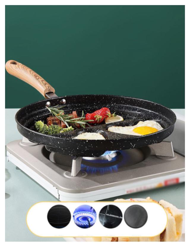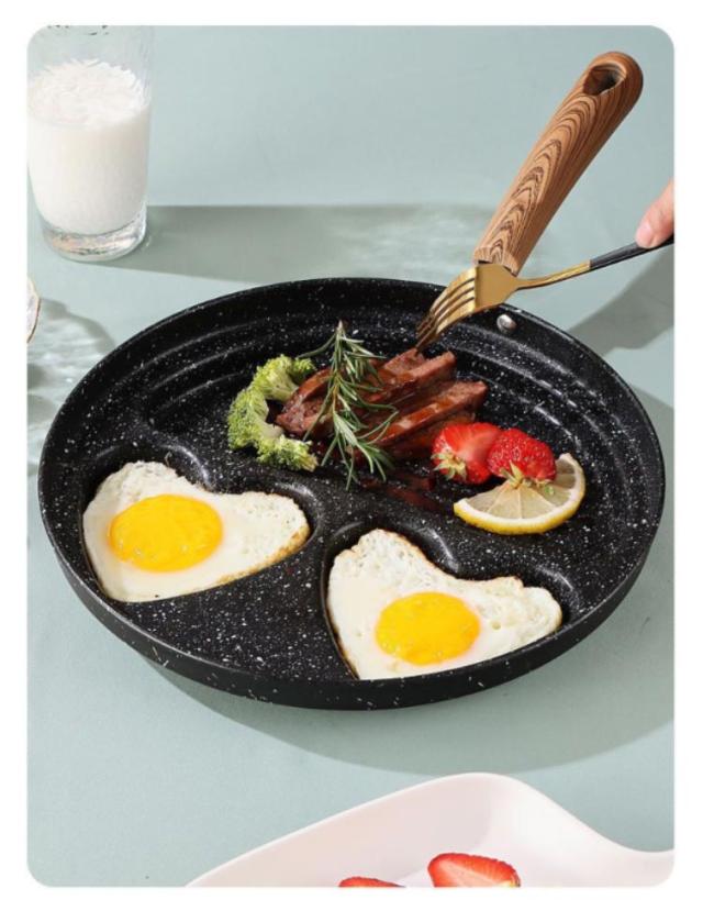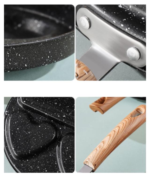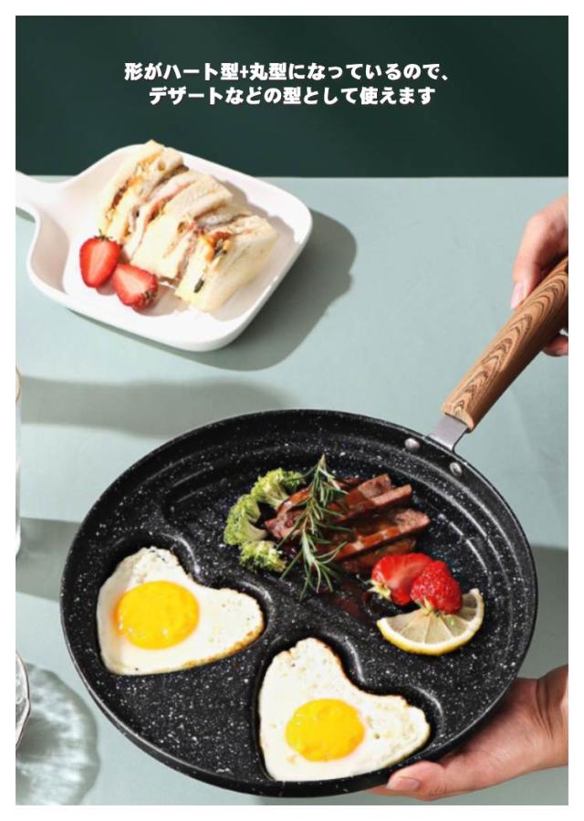 | フライパンが4つに区切られているので、お弁当のおかず作りに便利です。 形がハート型+丸型になっているので、デザートなどの型として使えます。 | |