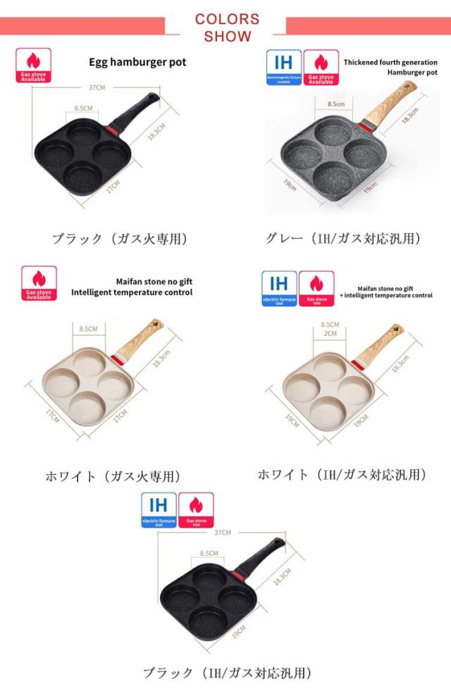 | 色 | ブラック(ガス火専用) グレー(IH/ガス対応汎用) ホワイト(ガス火専用) ホワイト(IH/ガス対応汎用) ブラック(IH/ガス対応汎用) |