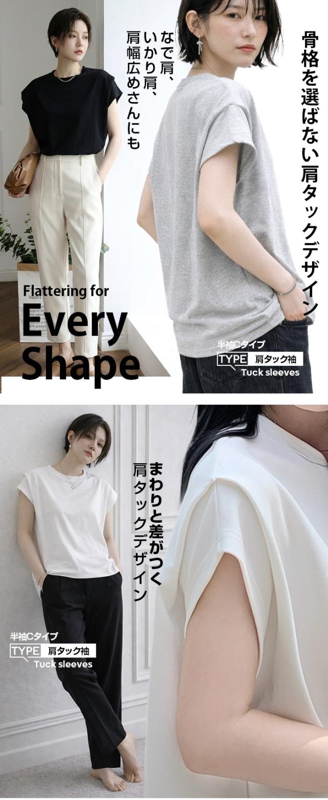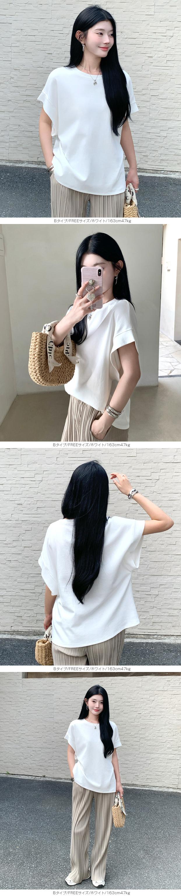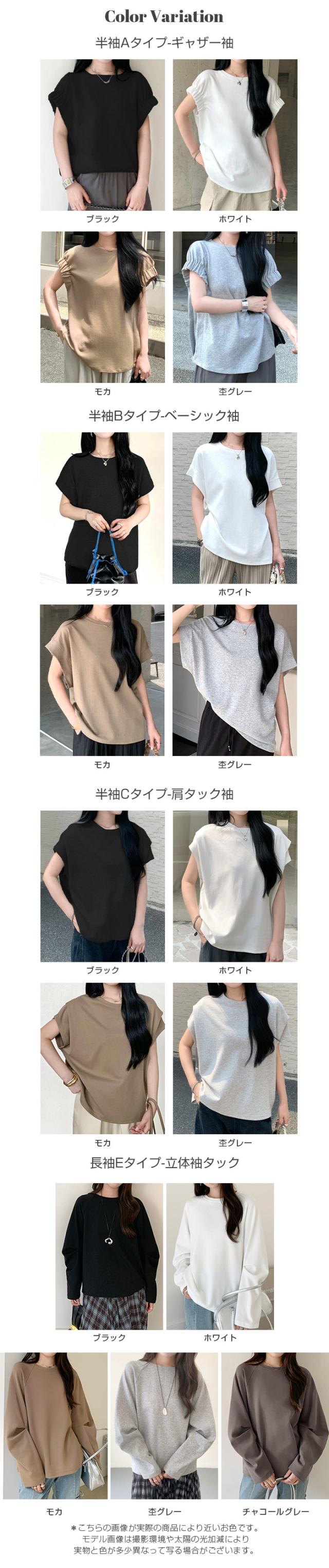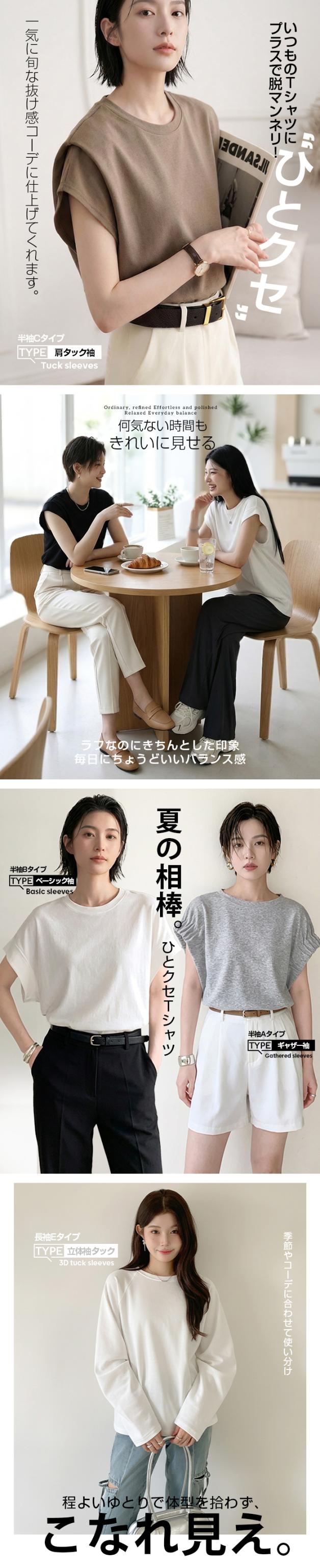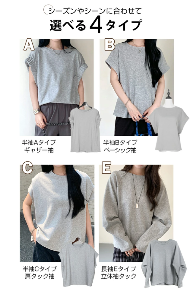 【 着痩せ革命 脱・普通のTシャツ 】 旬の“立体スリーブ”で腕ラインをすっきり見せる袖デザインTシャツ。 好みに合わせて半袖/長袖の2タイプから選べます。 半袖タイプ(A/B/C)… 袖デザインごとに異なる表情が楽しめる3タイプ展開。 Aタイプはギャザー入りのフレンチスリーブでやわらかく女性らしい印象に。 Bタイプはシンプルで着回しやすいベーシックデザイン。 Cタイプは肩タック入りで立体感があり、こなれた雰囲気を演出します。 ボリュームのある袖は二の腕を自然にカバーし、 脇部分はインナーが見えにくい設計で安心感も◎ クルーネック×無地で合わせやすく、 デニムからきれいめパンツまで幅広く対応します。 長袖タイプ(E)… 肩まわりはラグラン切替で動きやすく、 袖のタックデザインが立体感をプラス。 ゆったりとしたシルエットが体のラインを拾いにくく、 季節の変わり目にも使いやすい一枚です。 ゆるさのあるディテールがこなれた印象を演出。 コットン混のやさしい肌触りで着心地も良く、 デイリーユースにぴったりのアイテムです。 さらに半袖タイプは人気につき再販! ブラック/ホワイト/モカ/杢グレーの万能カラーで、 春・夏・秋とロングシーズン活躍します。 《商品ポイント》 ・半袖タイプ再販:人気のA/B/Cが再入荷 ・選べる4タイプ:用途や好みに合わせて選択可能 ・立体袖デザイン:二の腕を自然にカバー ・ラグランスリーブ(長袖):動きやすく快適 ・ゆったりシルエット:体型を拾いにくい ・無地デザイン:着回し力の高いベーシック仕様 ・コットン混素材:肌触りがやさしく快適 《デザイン・シルエット》 ・クルーネックで首元すっきり、アクセサリーも映える ・ヒップにかかる丈感で体型カバー ・ストレート寄りの身幅でバランスよく着用可能 ・袖の立体デザインで自然な細見えをサポート 《コーディネート提案》 ・デイリー:ワイドデニム+スニーカーでラフに ・きれいめ:タックパンツ+ローファー+ジャケット ・フェミニン:スカート+バレエシューズで上品に ・トレンド:ベストやジレを重ねたレイヤードスタイル 《サイズ・カラーバリエーション》 サイズ:FREE カラー:ホワイト/ブラック/モカ/杢グレー タイプ:(半袖)Aタイプギャザー袖 (半袖)Bタイプベーシック袖 (半袖)Cタイプ肩タック袖 (長袖)Eタイプ立体袖タック 《素材・機能性》 素材:コットン80%、ポリエステル20% ・透け感:ほとんど透けない ・伸縮性:若干あり ・厚み:普通 |