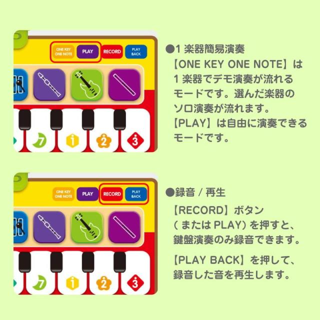 【8種の楽器音に切り替え可能】鍵盤上にある楽器アイコンを押すと、様々な楽器に切り替えることができ、お子様の聴覚の発達を刺激し、色、動物、文字の識別に役立ちます。