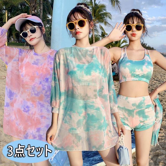 水着 レディース スイムウェア セパレート フィットネス ビーチ プール 体型カバー 3点セット 半袖 パッド付 20代 30代 40代 韓国 黒 おしゃれ 大きいサイズ 競泳水着
