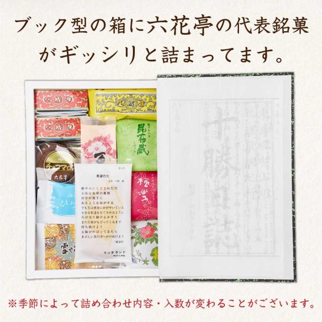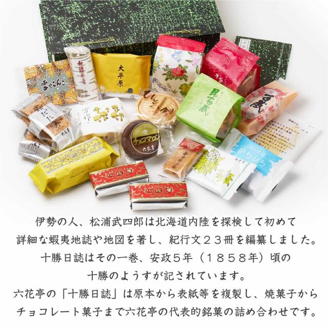 | 商品説明 | ありがとうの気持ちを北海道の銘菓セットにこめてお贈りしませんか? ブック型の箱に六花亭の代表銘菓がびっしり! 伊勢の人、松浦武四郎は北海道内陸を探検して初めて詳細な蝦夷地誌や地図を著し、紀行文23冊を編纂しました。 十勝日誌はその一巻、安政5年(1858年)頃の十勝のようすが記されています。 六花亭の「十勝日誌」は原本から表紙等を複製し、焼菓子からチョコレート菓子まで、六花亭の代表的銘菓を詰め合わせたギフトセットになります。 |