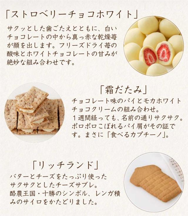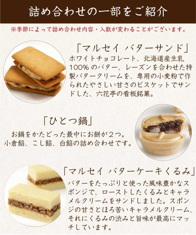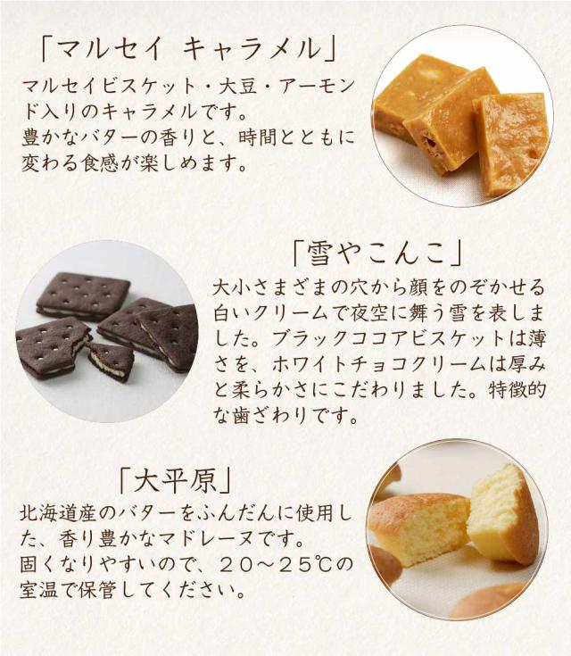 | 詰め合わせ内容 | ・マルセイバターサンド 2個 ・霜だたみ 2個 ・大平原 1個 ・ひとつ鍋(こし餡) 1個 ・百歳 1個 ・マルセイバターケーキ(くるみ) 2個 ・マルセイキャラメル 1個 ・白樺羊羹(こし餡) 1個 ・ストロベリーチョコ(ホワイト)袋入 1個 ・雪やこんこ 1個 ・リッチランド 1個 ・北加伊道 1個 ・ひとつ鍋(小倉) 1個 ・花の大地ひろびろ 2個 ・おかげさま 1個 ※季節によって詰め合わせ内容・入数が変わることがございます。 |