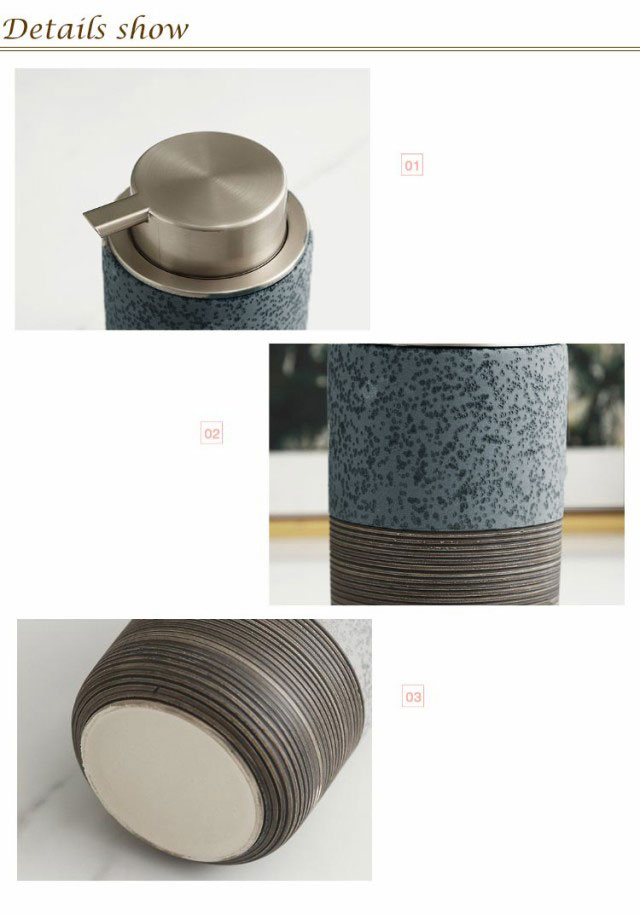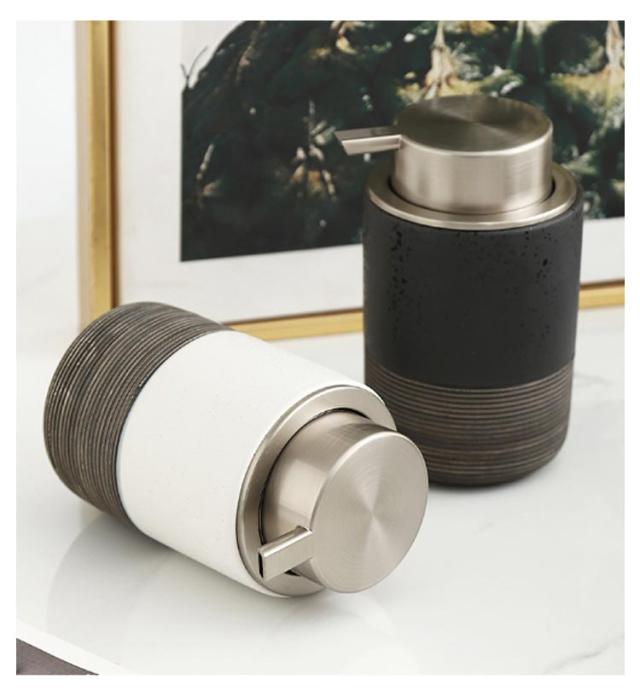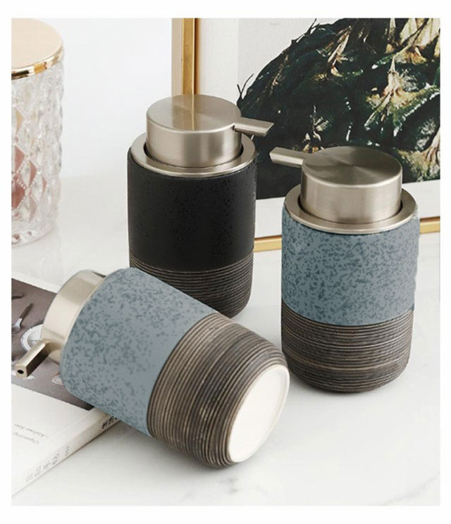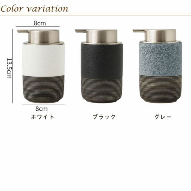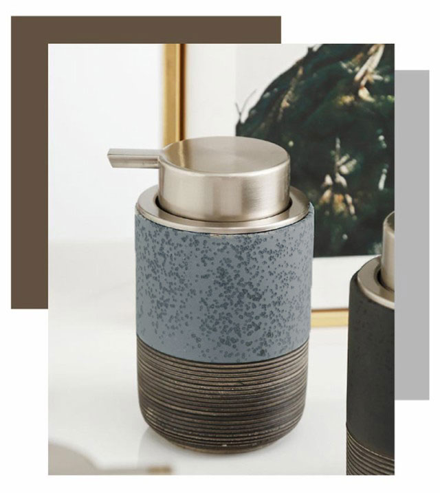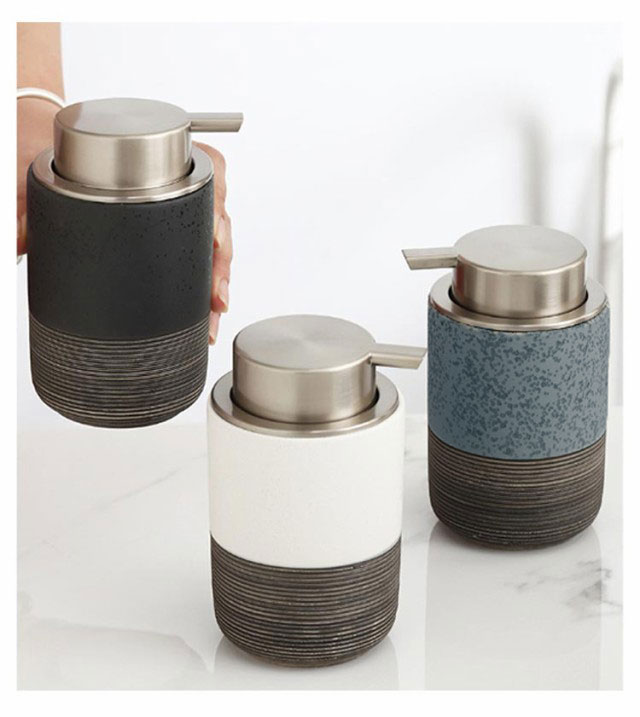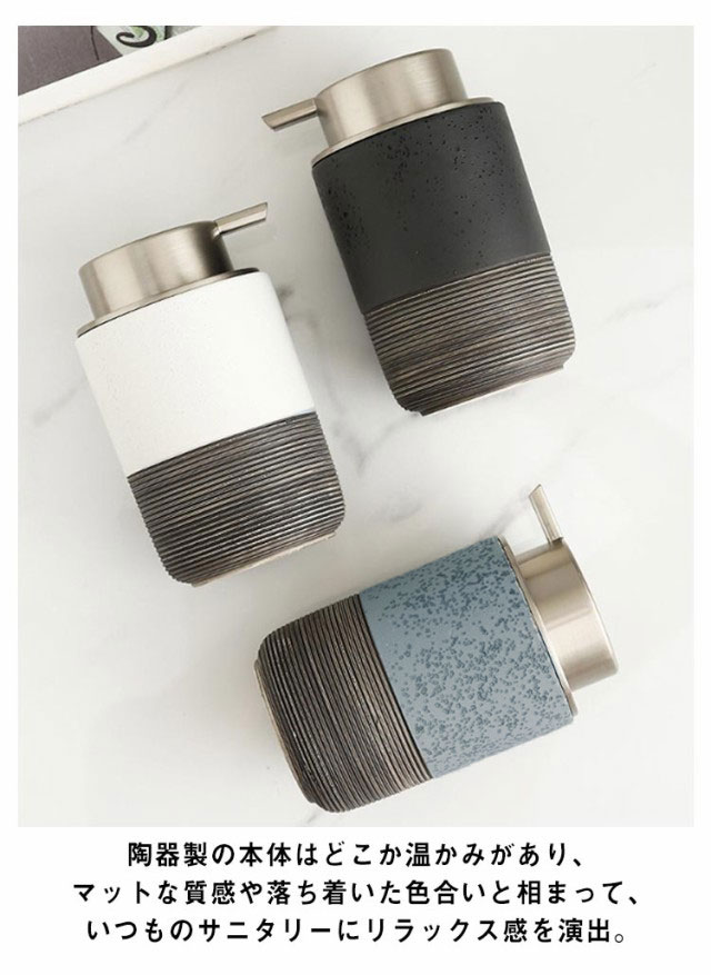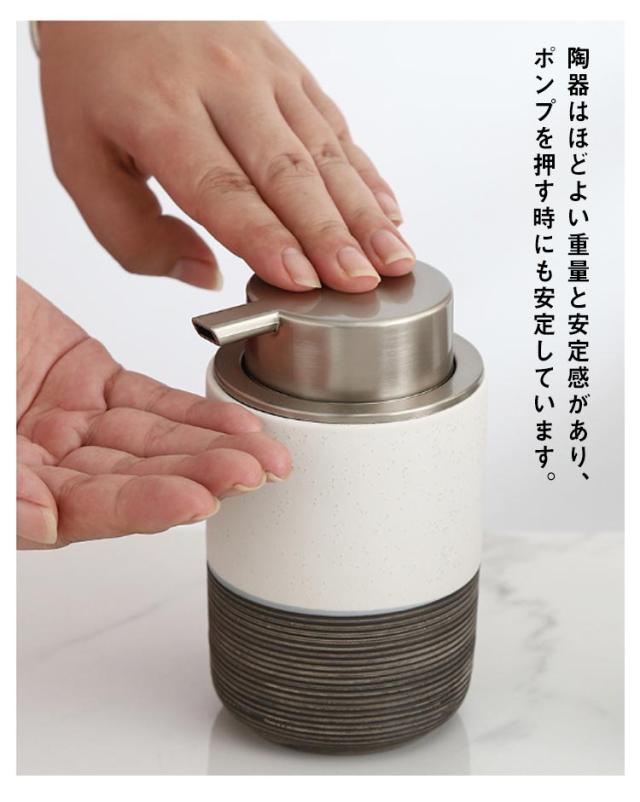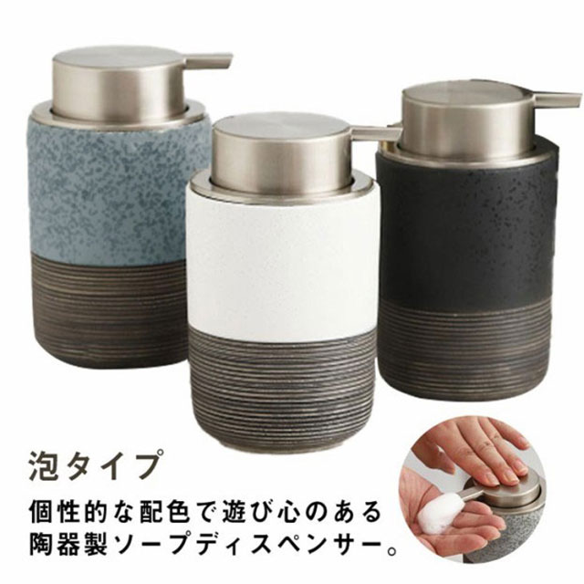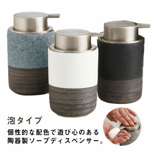 | 個性的な配色で遊び心のある陶器製ソープディスペンサー。 泡タイプ 陶器製の本体はどこか温かみがあり、マットな質感や落ち着いた色合いと相まって、いつものサニタリーにリラックス感を演出。 陶器はほどよい重量と安定感があり、ポンプを押す時にも安定しています。 | |