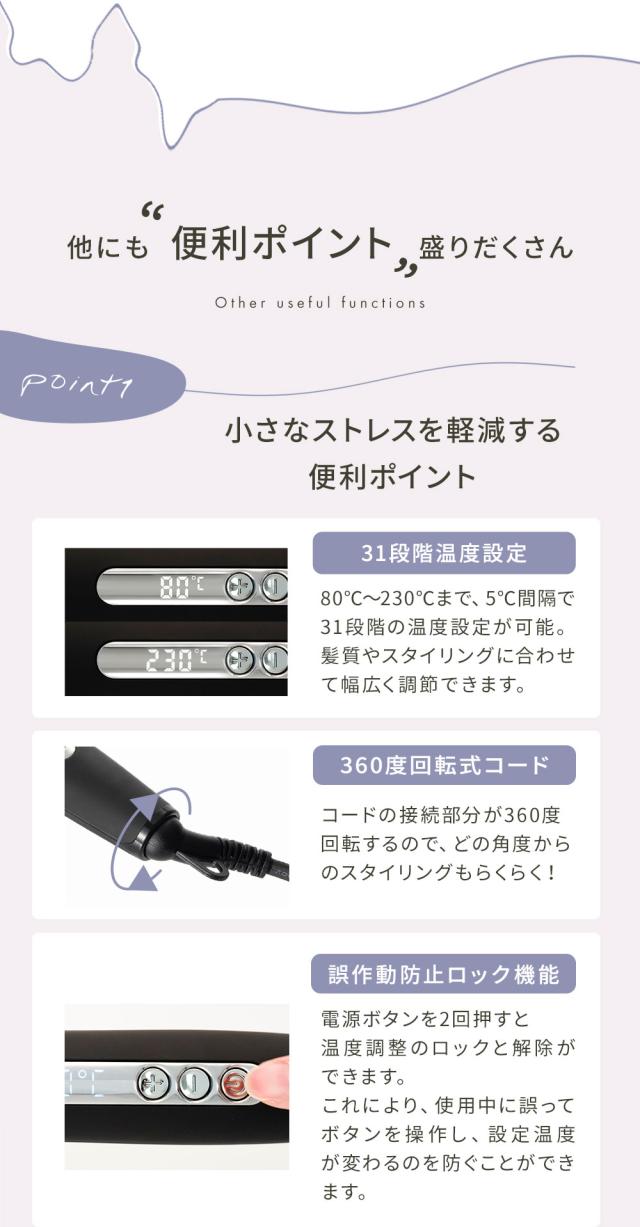 温度調整は縮毛矯正レベルの230℃まで設定が可能( 80 〜 230 ℃ )。5℃間隔設定で髪質に合わせたスタイリングが可能。