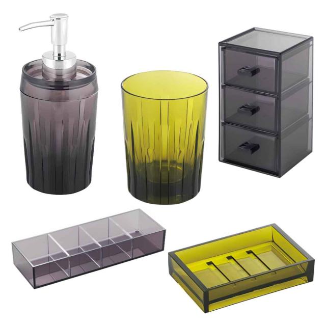 シックなカラーが大人っぽくて独特な雰囲気を持つ「ファセタ」シリーズです。ディスペンサー、ウォーターカップ、ソープディッシュ、3段ボックス、トレーで揃えると統一感が出ます。お好みのアイテムを揃えて自分だけの特別な空間がつくれます。