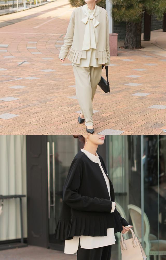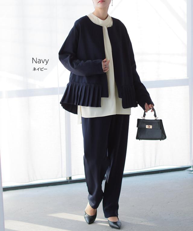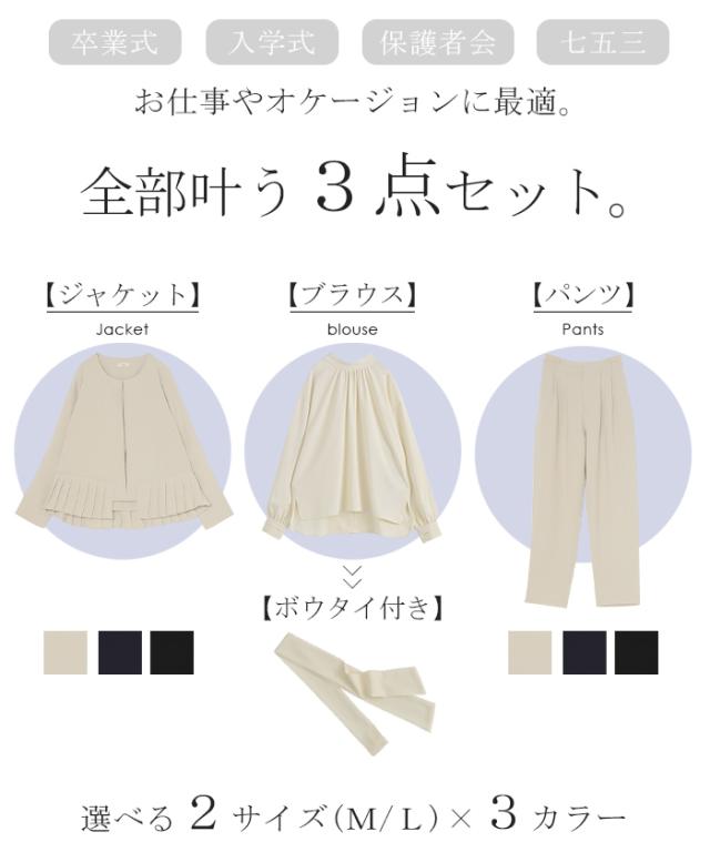 ジャケット、ブラウス、パンツまで付いたお得感のある3点セットアップです。