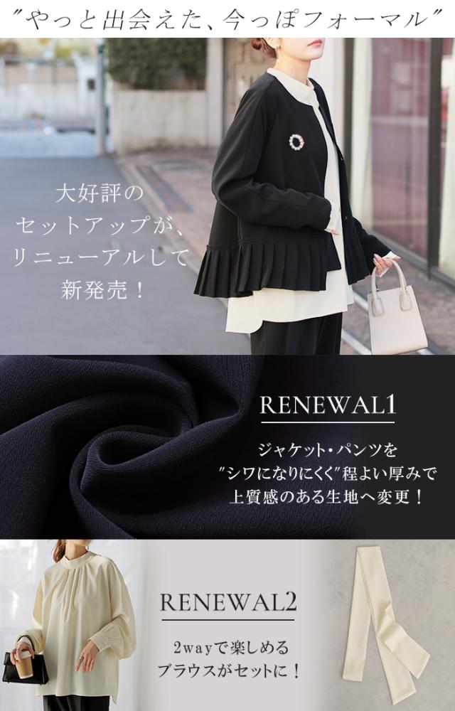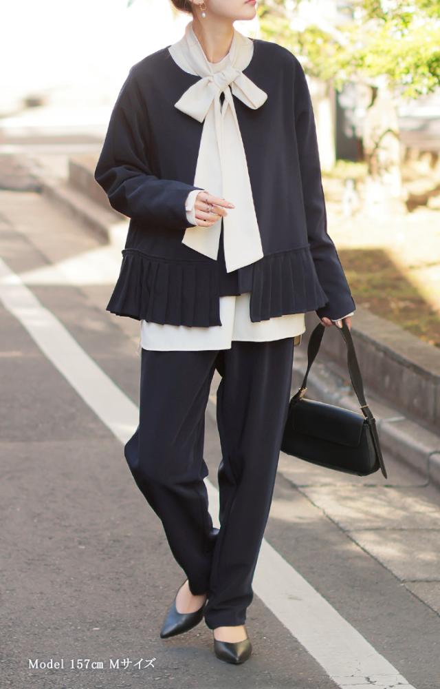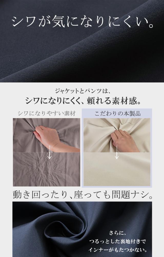 | 素材 | ブラウス:ポリエステル100% ジャケット・パンツ(表地):ポリエステル95% ポリウレタン5% ジャケット・パンツ(裏地):ポリエステル100% |