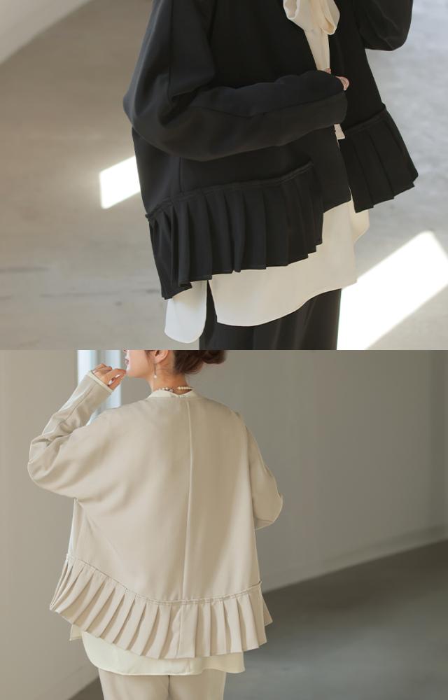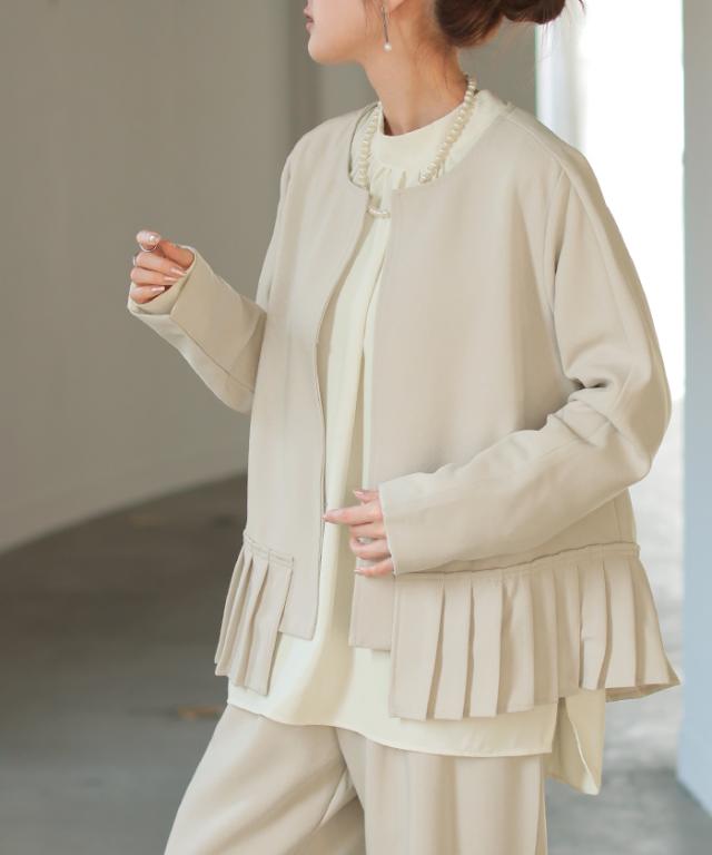 シンプルシルエットにジャケットのぺプラムデザインが映えフェミニンな雰囲気を醸し出すポイントに。