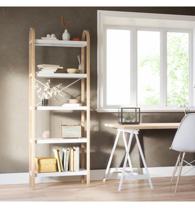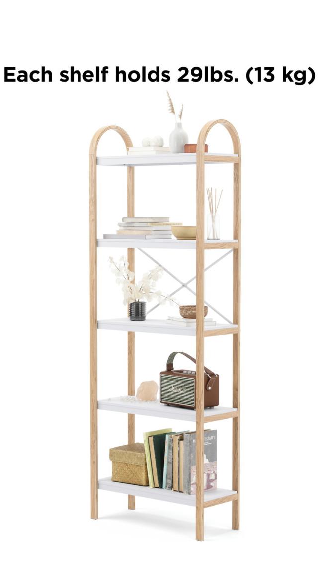 ベルウッドは、リビングルーム、ホームオフィス、ベッドルーム、バスルームなどで使用できます柔らかな木のカーブ:このモダンな自立型の棚には、装飾的な木製のブラケットが付いた5つの棚があります。