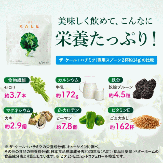 ケールは、ビタミン・ミネラル・食物繊維など、現代人に不足しがちな栄養素をしっかり補う「スーパーフード」です。はちみつは、エネルギー源であるとともに、ケールに含まれるミネラル等の吸収性を高めてくれる健康素材です。専用スプーン1杯(7g)あたり善玉菌を100億個配合(※1)。