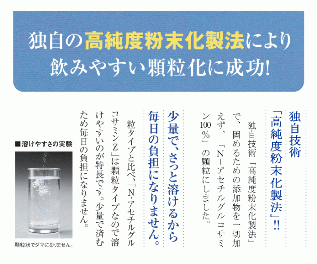 | 栄養成分:1袋530mgあたり | エネルギー/2.1kcal、たんぱく質/0.00g、脂質/0.00g、炭水化物/0.53g、ナトリウム/0.0mg、N-アセチルグルコサミン:500mg |