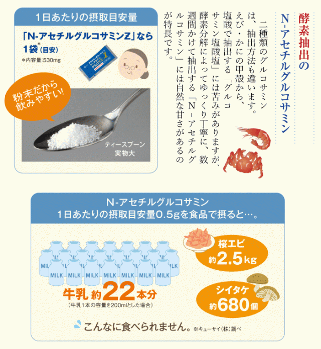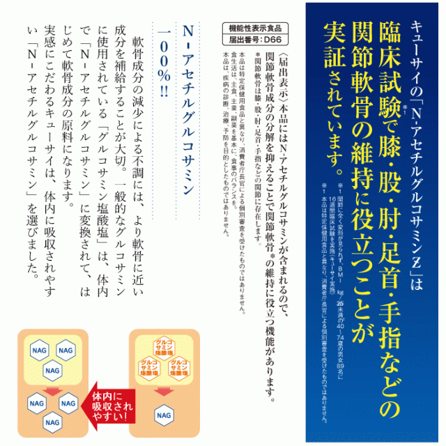 実感にこだわるキューサイは、体内に吸収されやすい「N-アセチルグルコサミン」を選びました。