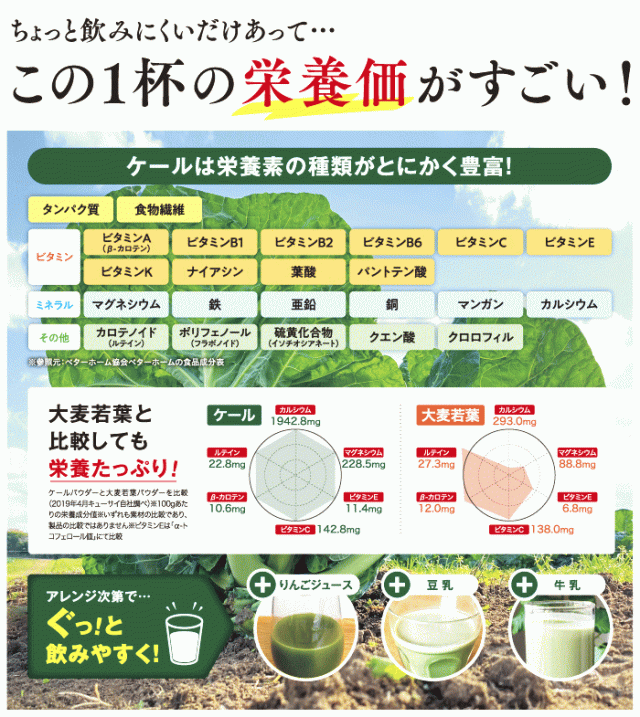 | 原材料名 | 栽培期間中農薬不使用・化学肥料不使用の国産ケール、ビタミンC |