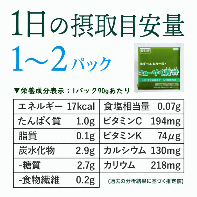 | 栄養成分:1パック(90g)あたり | エネルギー/17kcal、たんぱく質/1.0g、脂質/0.1g、糖質/2.7g、食物繊維/0.2g、食塩相当量/0.07g、ビタミンC/194mg、ビタミンK/74μg、カルシウム/130mg、カリウム/218mg ※過去の分析結果に基づく推定値 |
