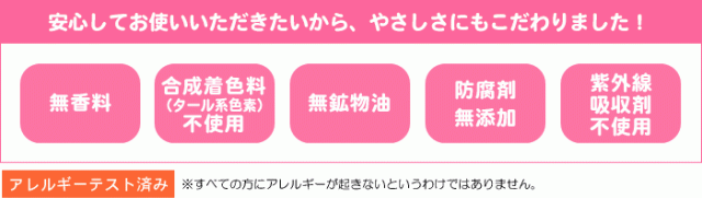 ※無香料、合成着色料(タール系色素)不使用、無鉱物油、防腐剤無添加、紫外線吸収剤不使用。