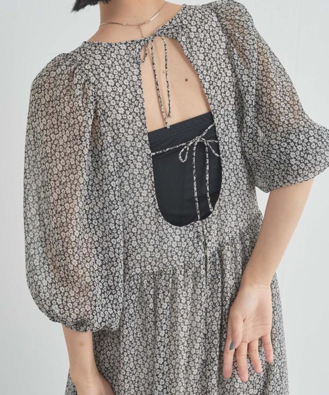 【裏地付/花柄/無地】ギャザー切替バックリボンワンピース