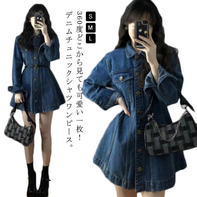 ハイウエスト デニム 送料無料 フレア ワンピース チュニック 美シルエット シャツ Aライン チュニック ミニワンピース ウエストベルト シンプル ナチュラル デニムワンピース