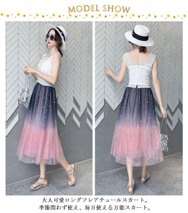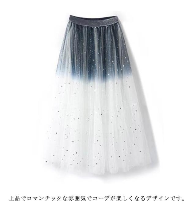 送料無料 バイカラー 星空 ボトムス スカート 配色 レディース チュールスカート ミモレ丈 チュールスカート プリーツスカート チュールスカート グラデーション スカート フレア 大人 星柄 体型カバー ウエストゴム 裏地あり フレア