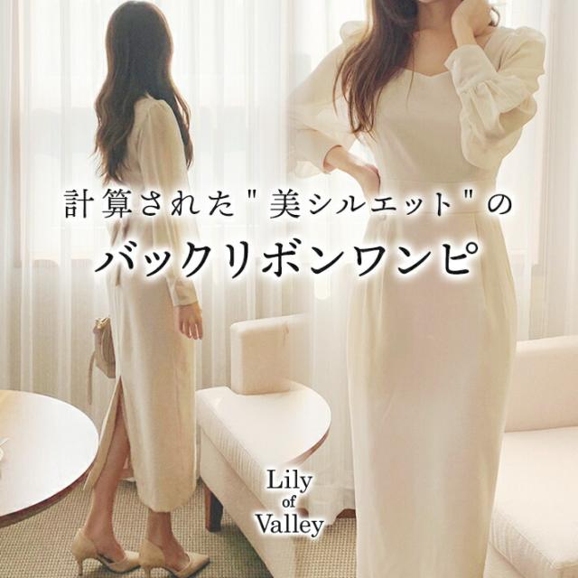送料無料&即納★ バックリボン 無地 タック ワンピース 結婚式 二次会 長袖 きれいめ 上品 清楚 / レディース ロングワンピース ロング ロング丈 ドレス シフォン 大きいサイズ ボリュームスリーブ ミモレ丈 スリット 韓国 タイト 膝下 大人可愛い アプリコット 冬 秋冬 春
