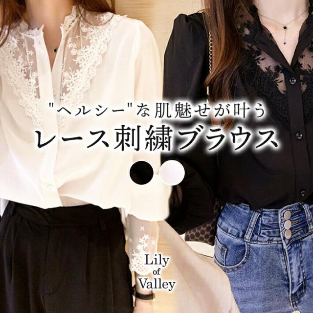送料無料&即納★ レース 刺繍 ドレッシー ブラウス トップス きれいめ 上品 韓国 オフィスカジュ / レディース シャツ 長袖 無地 シアー 清楚 ハイネック パフ袖 カジュアル オフィス Vネック ボリュームスリーブ 事務服 大人可愛い 白 黒 ホワイト ブラック 春 秋 冬 秋冬