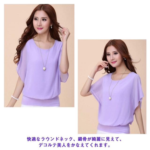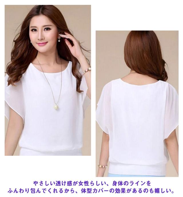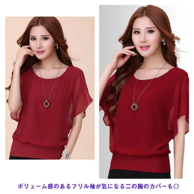 | ふんわり滑らか夏ブラウス 快適なラウンドネック、鎖骨が綺麗に見えて、デコルテ美人をかなえてくれます。 柔らかな印象のシフォン素材がふんわりとした着心地を実現! やさしい透け感が女性らしい、身体のラインをふんわり包んでくれるから、体型カバーの効果があるのも嬉しい。 ボリューム感のあるフリル袖が気になる二の腕のカバーも◎ 程よい丈感、シンプルなデザインはどんなボトムスにも着まわしやすいです。 1枚で着るのはもちろん、インナーにも使えます。 | |