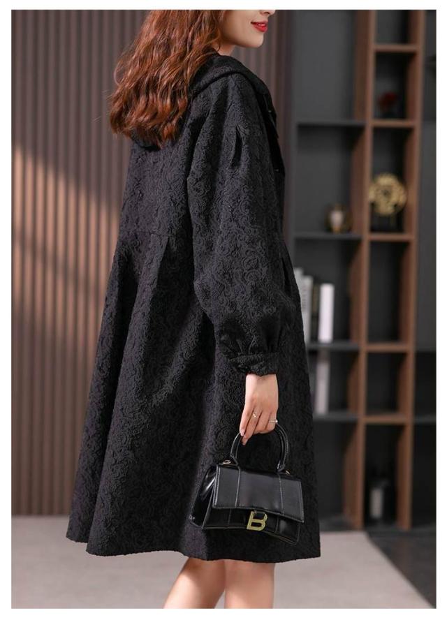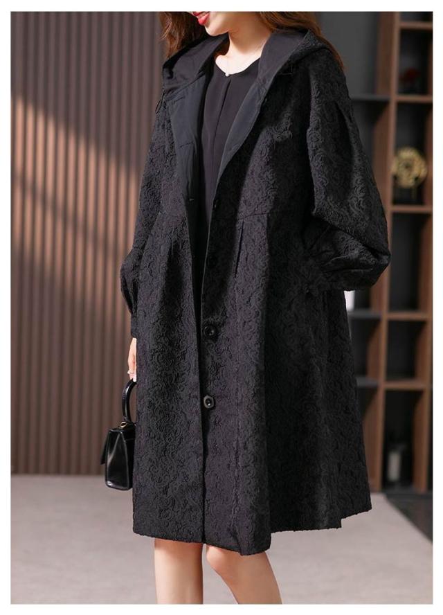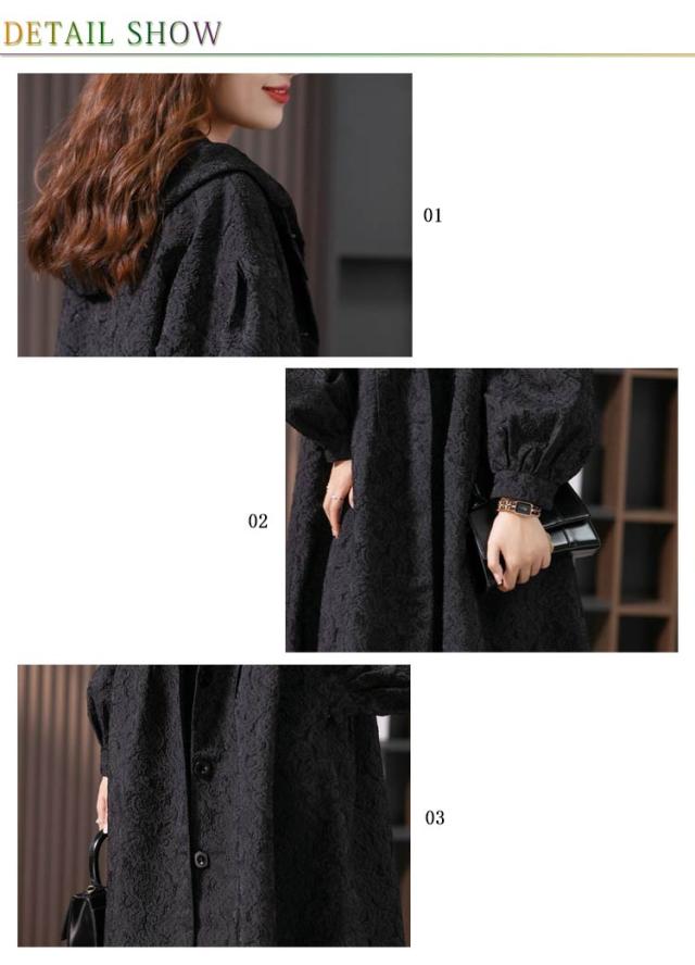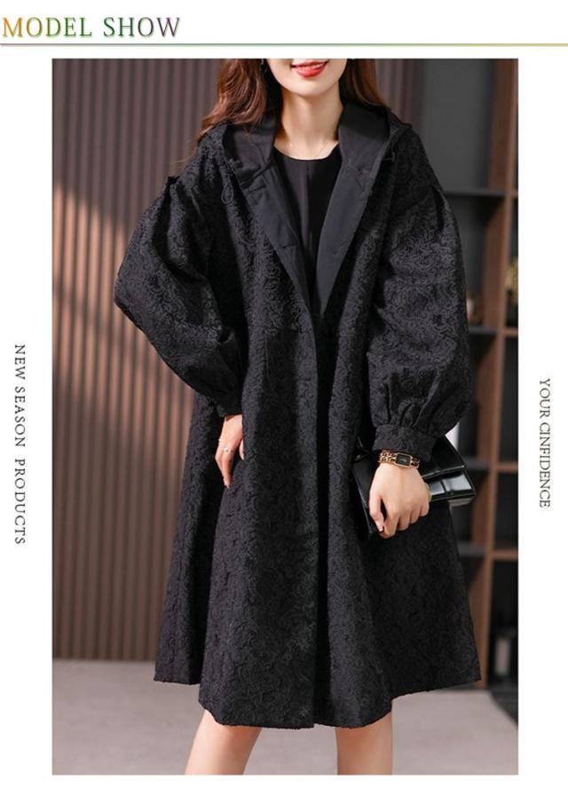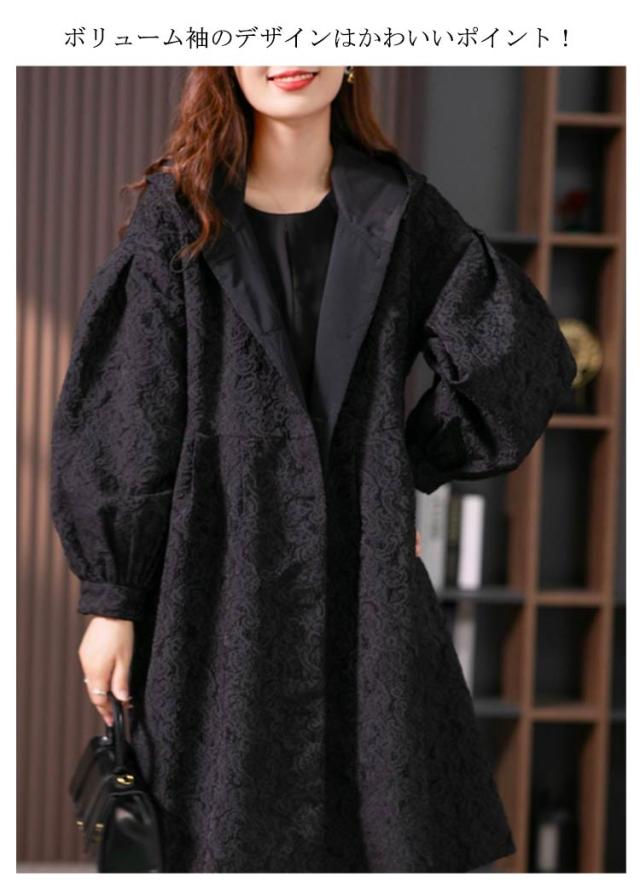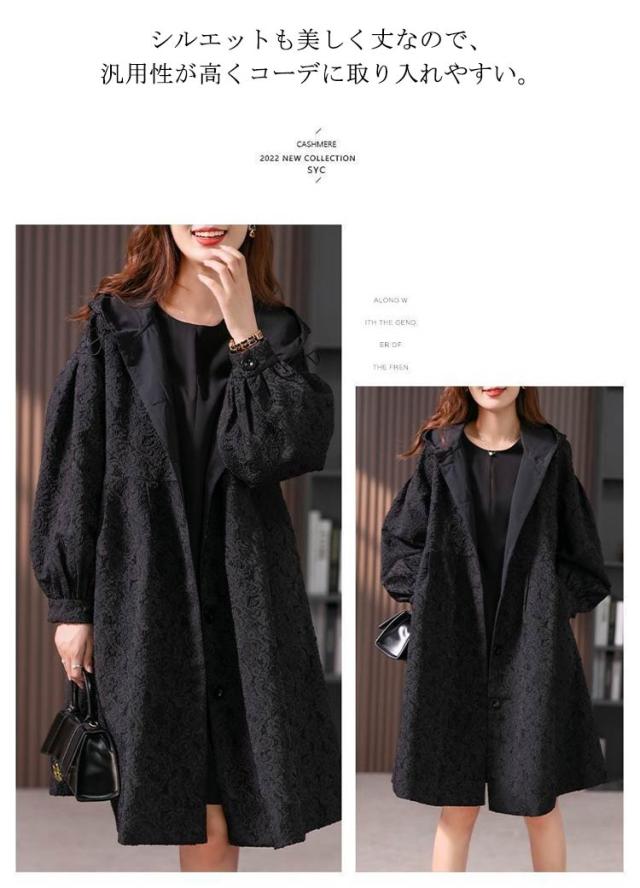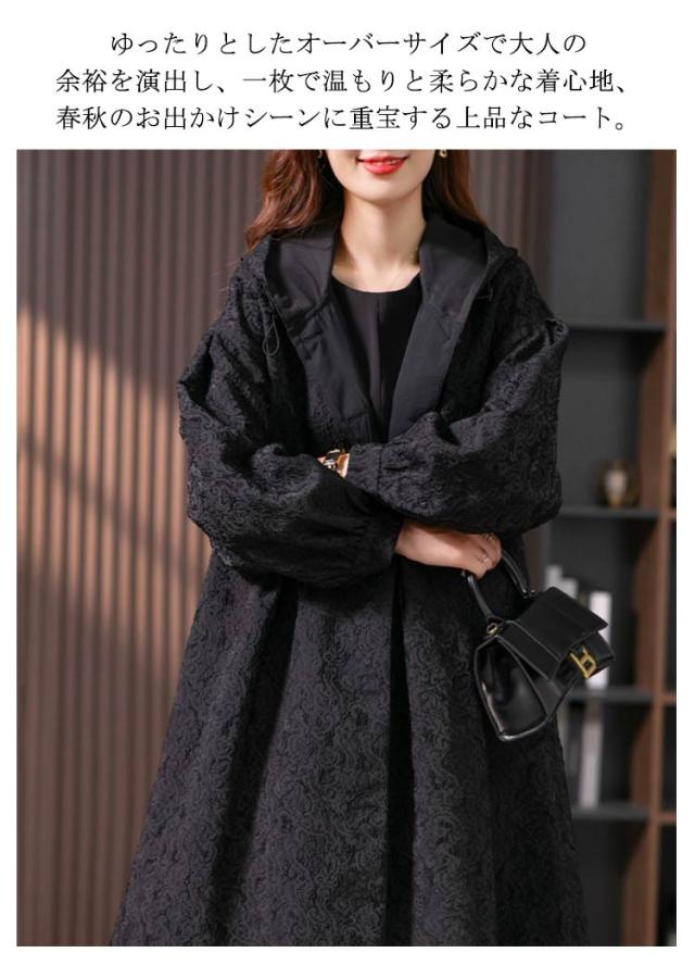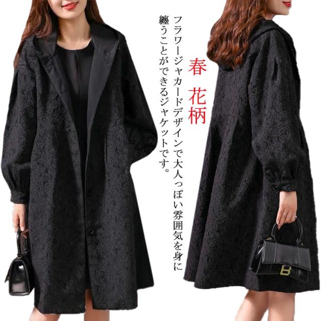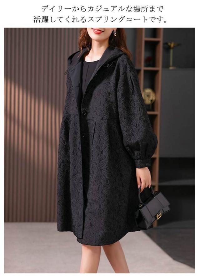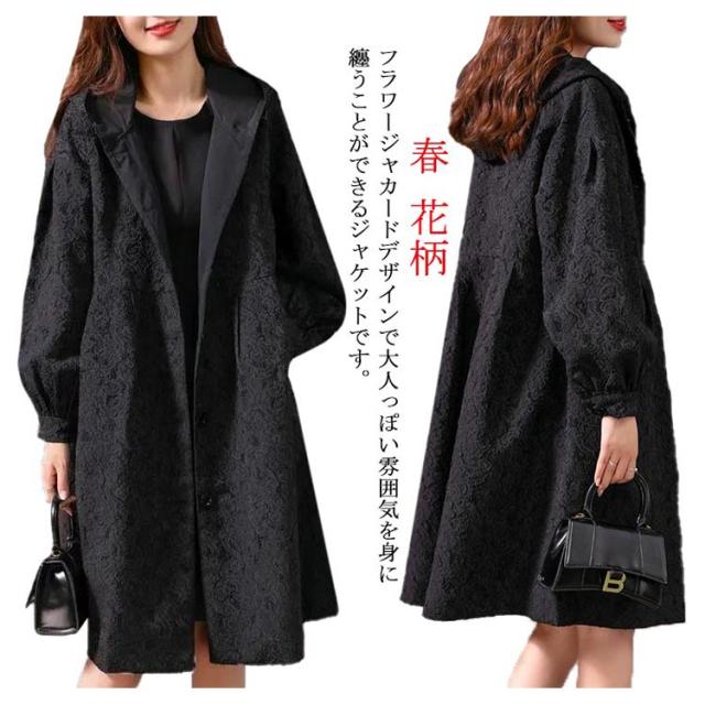 フラワージャカードデザイン!レディース ロングコート スプリングコート 春服 秋服 コート ロング丈 フード付き バルーン袖 フェミニン ライトアウター 大きいサイズ 春アウター モッズコート かわいい S M L XL 2XL