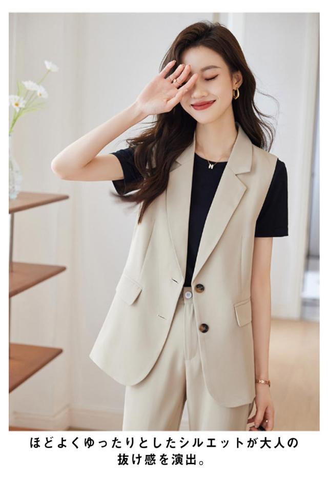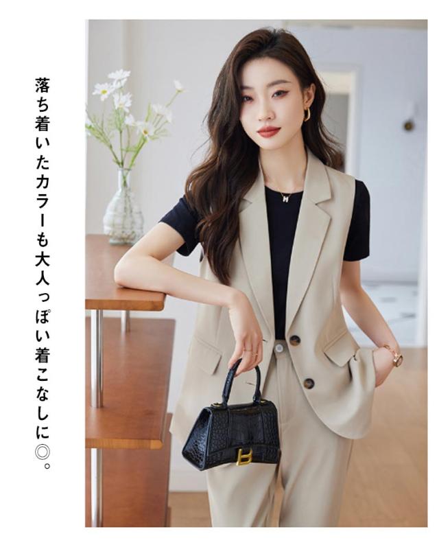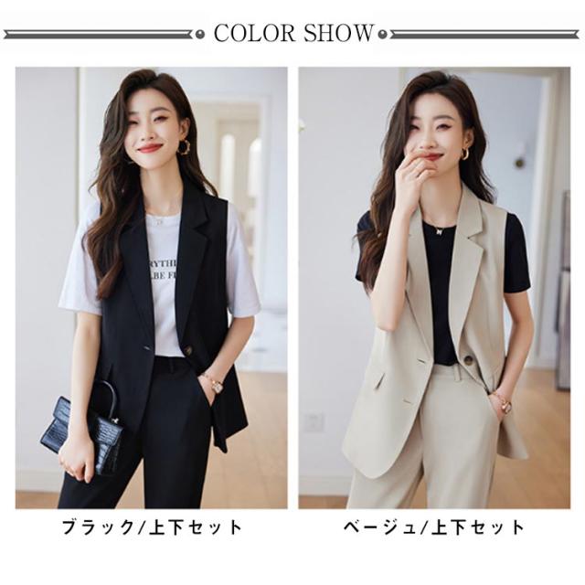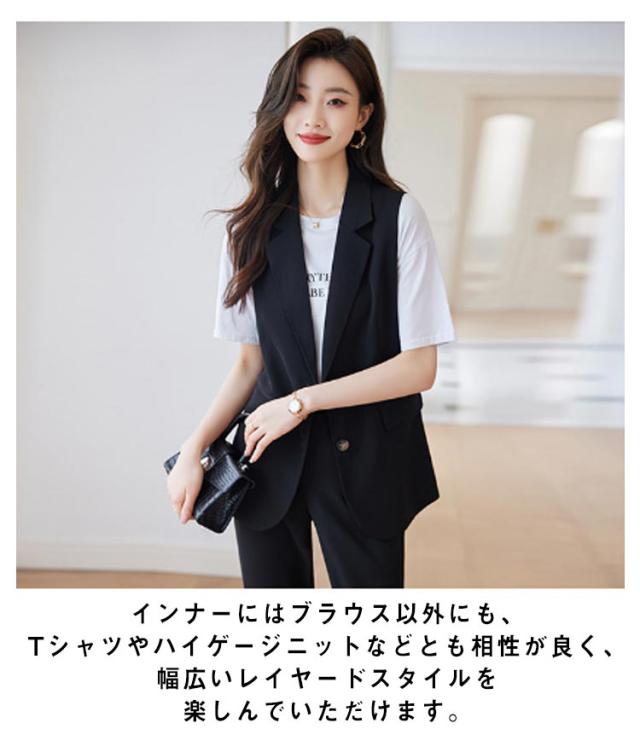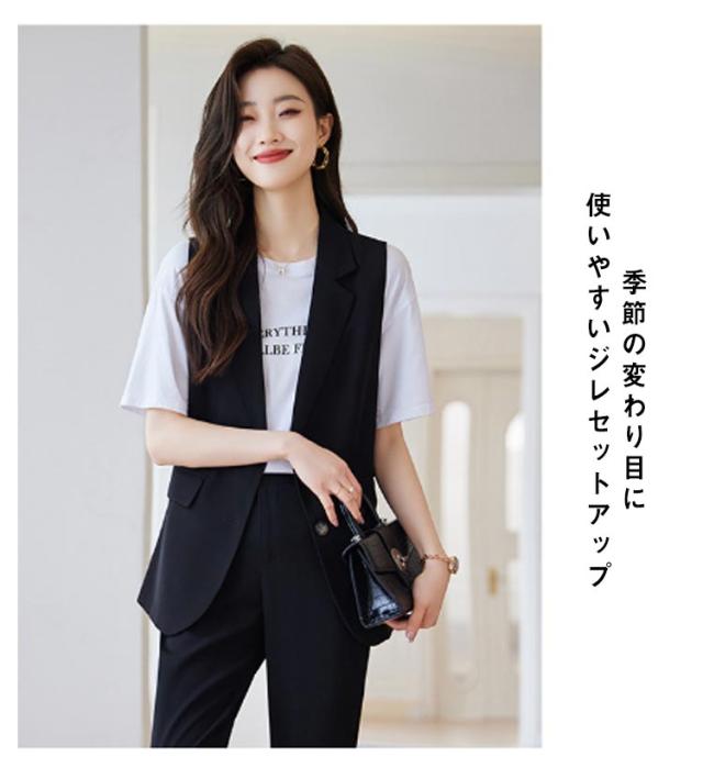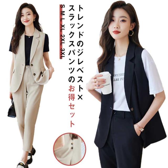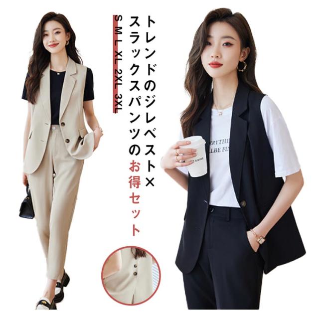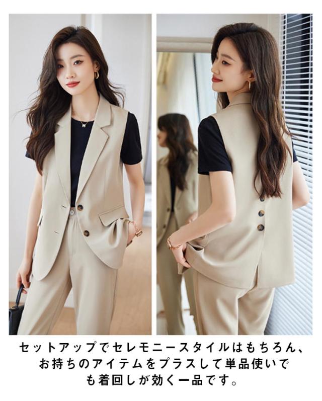ジレ パンツスーツ レディース 上下セット セットアップ テーパードパンツ 2つ釦 テーラードジレ+スラックスパンツ 袖なし ノースリーブ テーラードカラー 背中ボタン バックスリット入り 通勤 学校行事 オフィス カジュアル おしゃれ きれいめ 春 秋 全2色