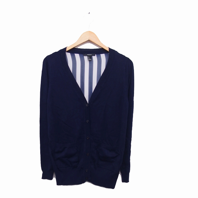 【中古】フォーエバー21 FOREVER21 カーディガン ニット 切替 長袖 Vネック ストライプ S ネイビー /KT19 レディース
