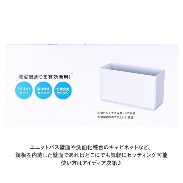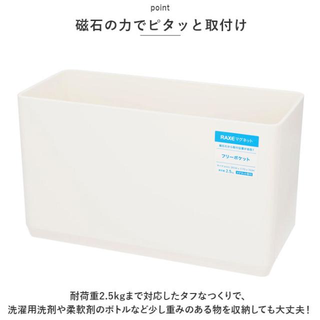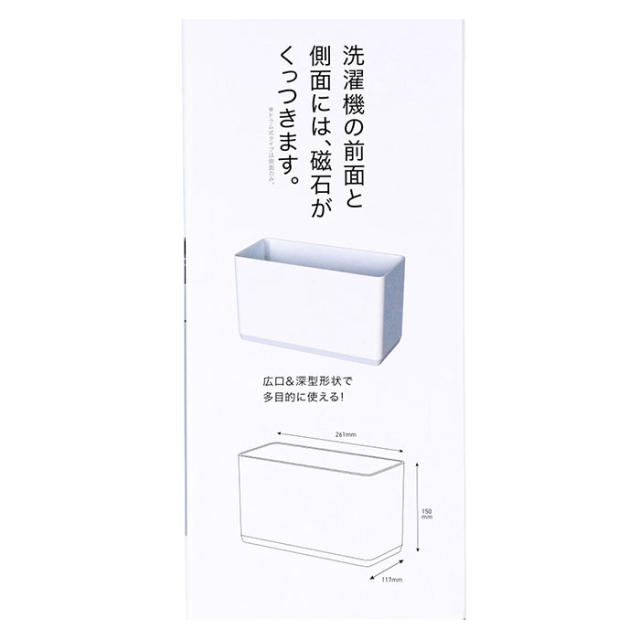 | 商品説明 | ・洗濯機横の隙間スペースを有効活用!サニタリールームがすっきり片付く「RAXE-ラックス- MGフリーポケット」が新登場。 【磁石の力でピタッと取付け】 ・フリーポケットの背面のマグネットシートで、洗濯機の側面や前面にピタッとくっついて、取り付け位置の調整も自在。(※ドラム式タイプの洗濯機は側面のみの取り付けとなります。) 【多目的に使えるシンプル形状】 ・多目的に使える「広口&深型形状」で、洗濯ネットや洗濯用ピンチ・掃除用スポンジなど様々なグッズが収納可能。 【洗濯機の表面を傷つけない】 ・洗濯機の表面や壁面を傷つける心配のないラバーマグネットを使用。設置時に特別な工具やネジ止めが不要なのもうれしいポイント。 【耐荷重2.5kg】 ・耐荷重2.5kgまで対応したタフなつくりで、洗濯用洗剤や柔軟剤のボトルなど少し重みのある物を収納しても大丈夫! 【清潔感のあるカラーリング】 ・ホワイト1色のすっきりとしたモノトーンカラーが、サニタリールームを落ち着いた雰囲気に演出! 【様々な場所でマルチに活躍】 ・ユニットバス壁面や洗面化粧台のキャビネットなど、鋼板を内蔵した壁面であればどどこにでも気軽にセッティング可能。使い方はアイディア次第♪ |