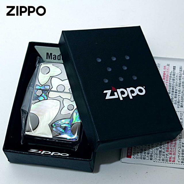 花柄のシェルを埋め込んだ可愛らしいZIPPO。この技法はインレイ(象嵌)と言い、土台となる素材に別種の素材を埋め込んで模様を描く装飾技法です。シェルも異なる2つの色味を用意。女性への贈り物にオススメ!