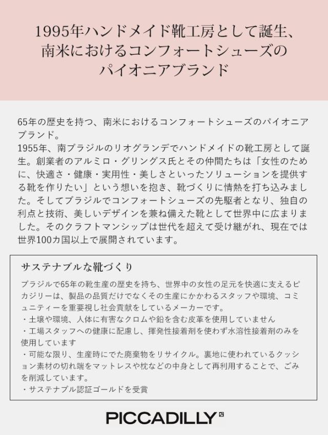 | 【PICCADILLY(ピカジリー)のパンプス】 最新テクノロジーを駆使した独自の軽量・ソフトな機能性素材で「疲れ」「摩擦」「蒸れ」から解放!解剖学アプローチでヒールとは思えない安定感!「ヒール=我慢」のイメージを覆します。 ■超ソフトな素材を使用 パンプスなのにスニーカーよりも柔らかい!? 甲革、ソールに超ソフトな素材を使用し、柔軟性や耐久性をポイントに応じて使い分け、足に吸い付くフィット感が病みつきに。 パンプスでこれほどに足が自由に動く感覚は初めてと言っても過言ではない、究極の履き心地を実現しました。 ■ピカジリー独自のプライムテック素材 一般的な合成皮革とは異なる、軽量で丈夫なオリジナル素材を使用。傷が付きにくい、色移りしにくいなど。水にも強く、ちょっとした雨の日にも履きやすい使用になっています。(※動物性素材不使用) ■足を酷使するキャビンアテンダントも愛用 機内で12時間以上立ち仕事をする足に過酷な環境でも、その履きやすさから世界的な航空会社のキャビンアテンダントに選ばれています。(空港内でCA向けにポップアップストアも定期開催されています!) |