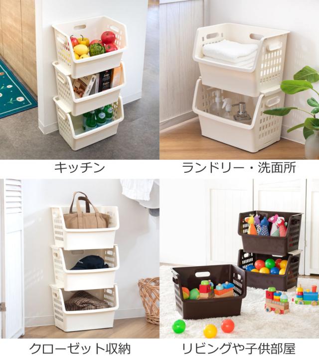 積み重ねできる収納バスケットは、一つでも積み重ねて使っても家中どこでも便利に使えるバスケットです。キッチンでは食品ストック置き場に、ランドリーや洗面所ではタオルや洗剤の収納に、クローゼットでは洋服やバッグなどの小物収納、リビングや子供部屋ではおもちゃや子供用品などの整理整頓に活躍します。