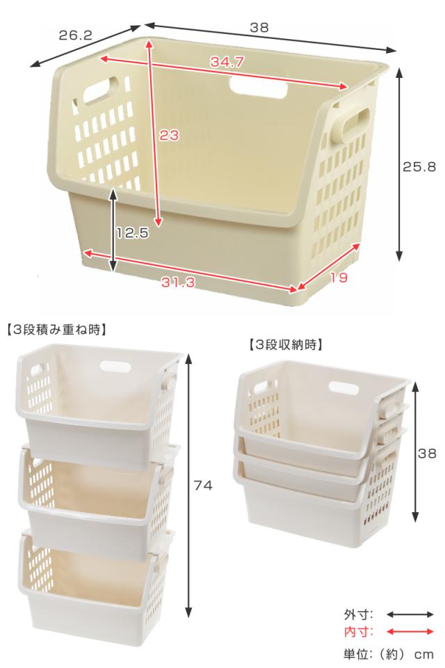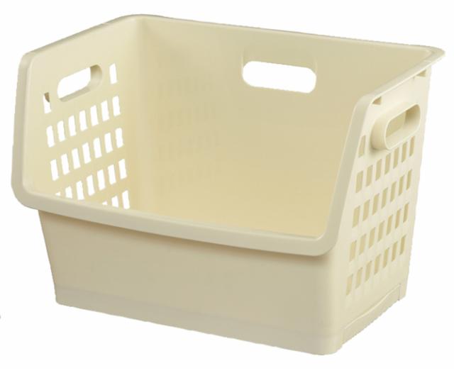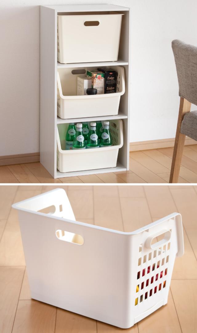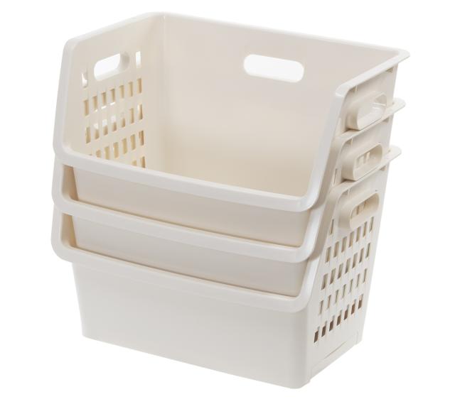 バスケットの間口は広く、積み重ねたままでも物の出し入れがスムーズに行えます。また、フタが無いのでよく使うものや、すぐに取り出したいものを収納するのに便利です。