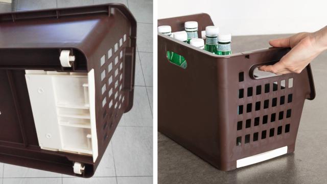 バスケットには500mlのペットボトルなら10本まで収納が可能です。積み重ね時の耐荷重は5kgまでです。側面には持ち手の穴が付いているので、持ち運びしやすい形状になっています。