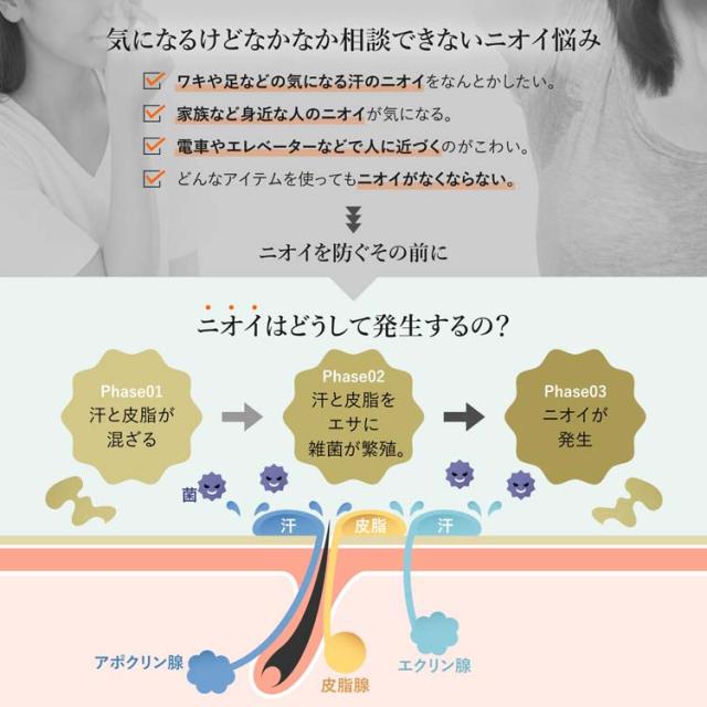 ニオイの元を殺菌・消毒。体臭・汗臭をしっかり防ぐ。