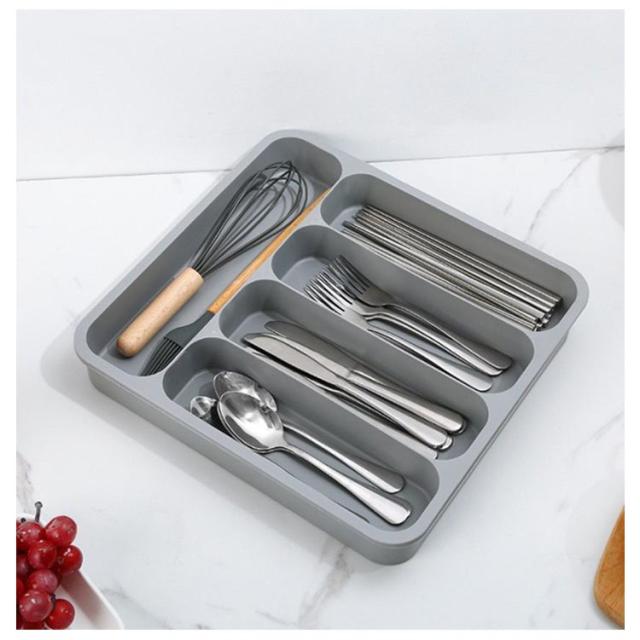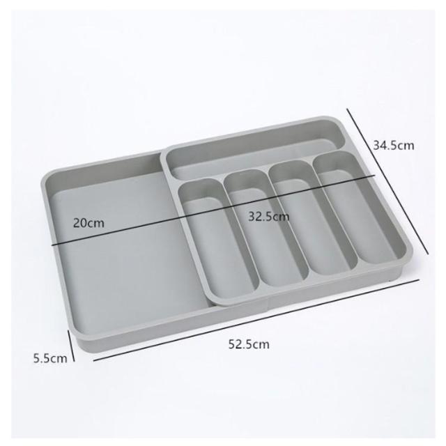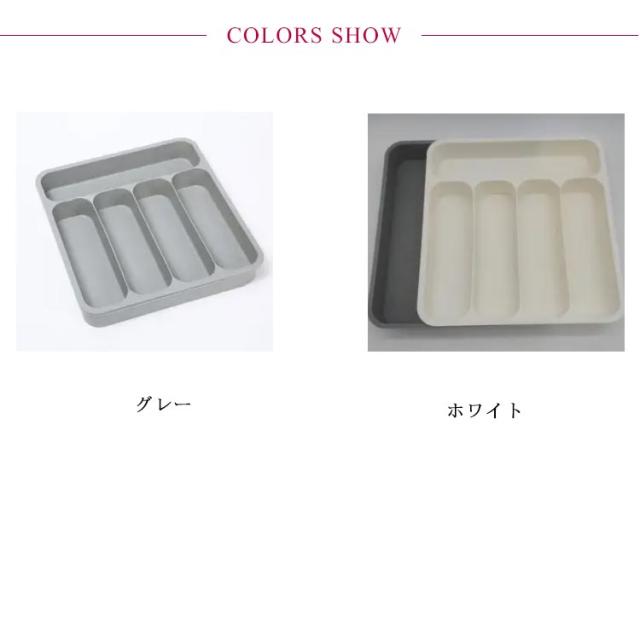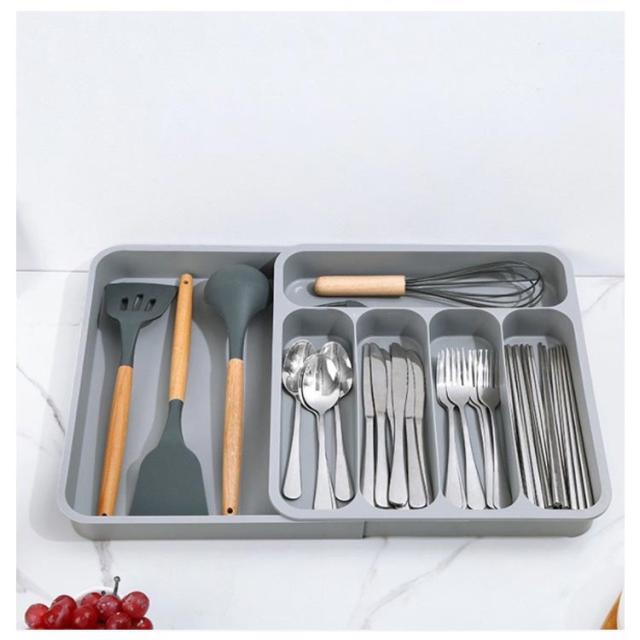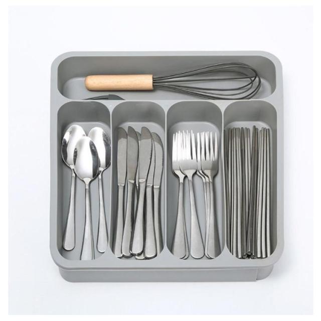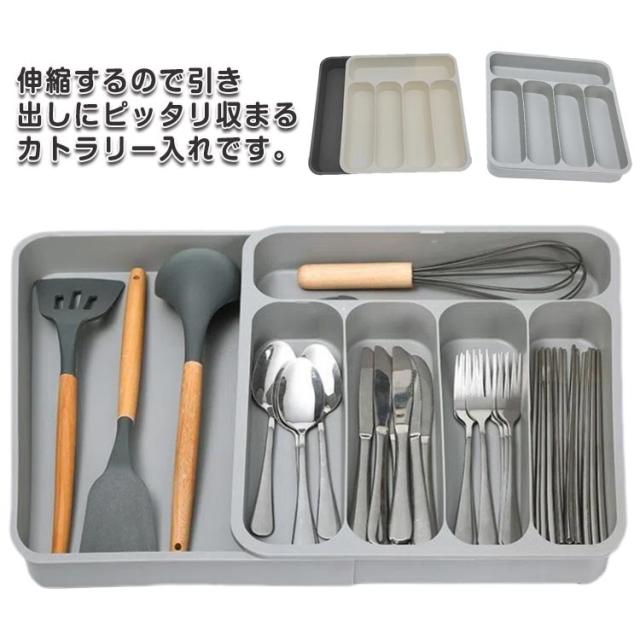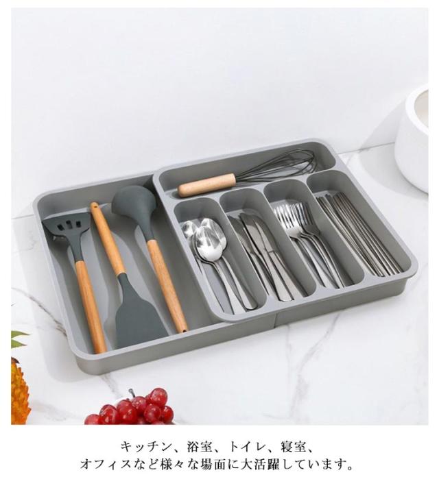 | 伸縮するので引き出しにピッタリ収まるカトラリー入れです。 箸置きや箸、ティースプーン、フォークなどを分けて収納できますので、探す手間が省けてとっても便利。 カトラリートレーとしての使用はもちろん、小物入れケース、引き出し整理なども使用できます。 キッチン、浴室、トイレ、寝室、オフィスなど様々な場面に大活躍しています。 | |