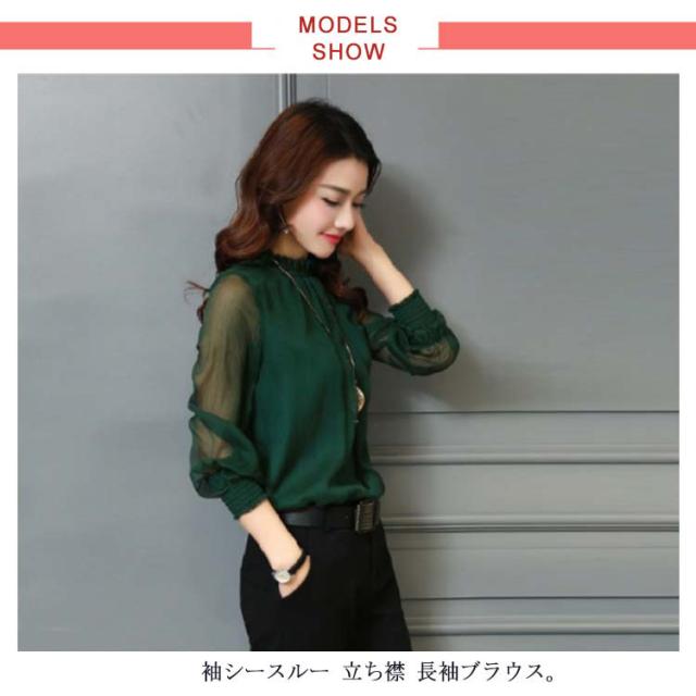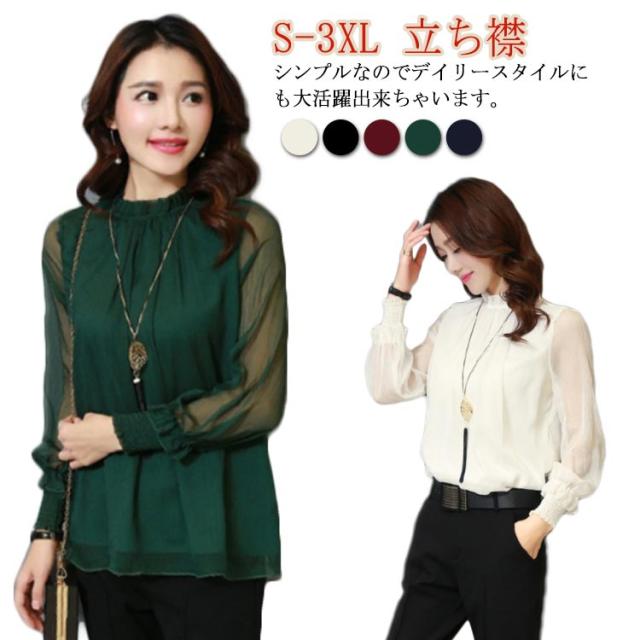 ブラウス レディース シフォン ブラウス 長袖 トップス 袖 シースルー フォーマル きれいめ オフィス 大人 上品 春 夏 秋 冬 スタンドカラー 大きいサイズ シャツ 立ち襟 フリル ビジネス シンプル ダンス衣装 30代 40代 50代 60代 通勤 仕事 大きいサイズ 黒 白 S-3XL