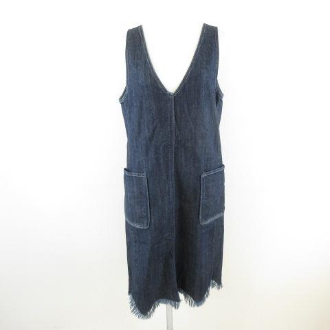 【中古】AMLILE デニムジャンパースカート ジャンスカ 膝丈 フリンジ ストレッチ インディゴ 紺 1 *E731 レディース