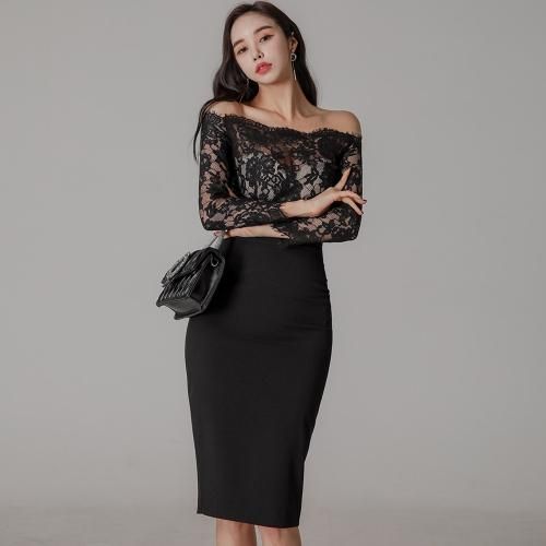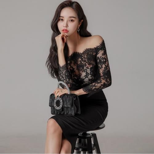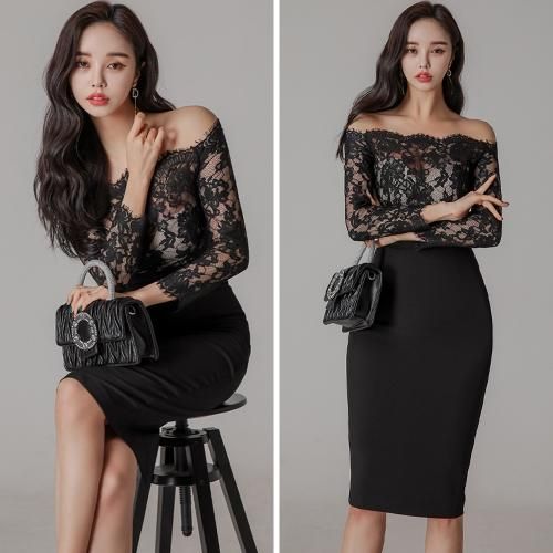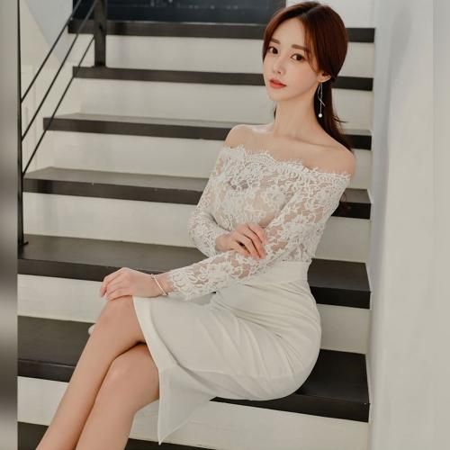 【グラシア】 キャバ ドレス キャバドレス ワンピース ミディアムドレス エレガント オフショル タイト 華やか ヌーディ 透け感 レース アイラッシュレース ブラック ホワイト S M L XL