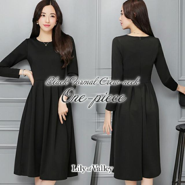 ワンピース きれいめ フォーマル 黒 クルーネック フレア Aライン ブラック ドレス ひざ丈 長袖 レディース 無地 膝丈 ミディ ミディアム ロング 大きいサイズ パーティードレス ブラックフォーマル 黒ワンピース 黒ドレス 上品 冠婚葬祭 結婚式 二次会 演奏会 喪服 葬式